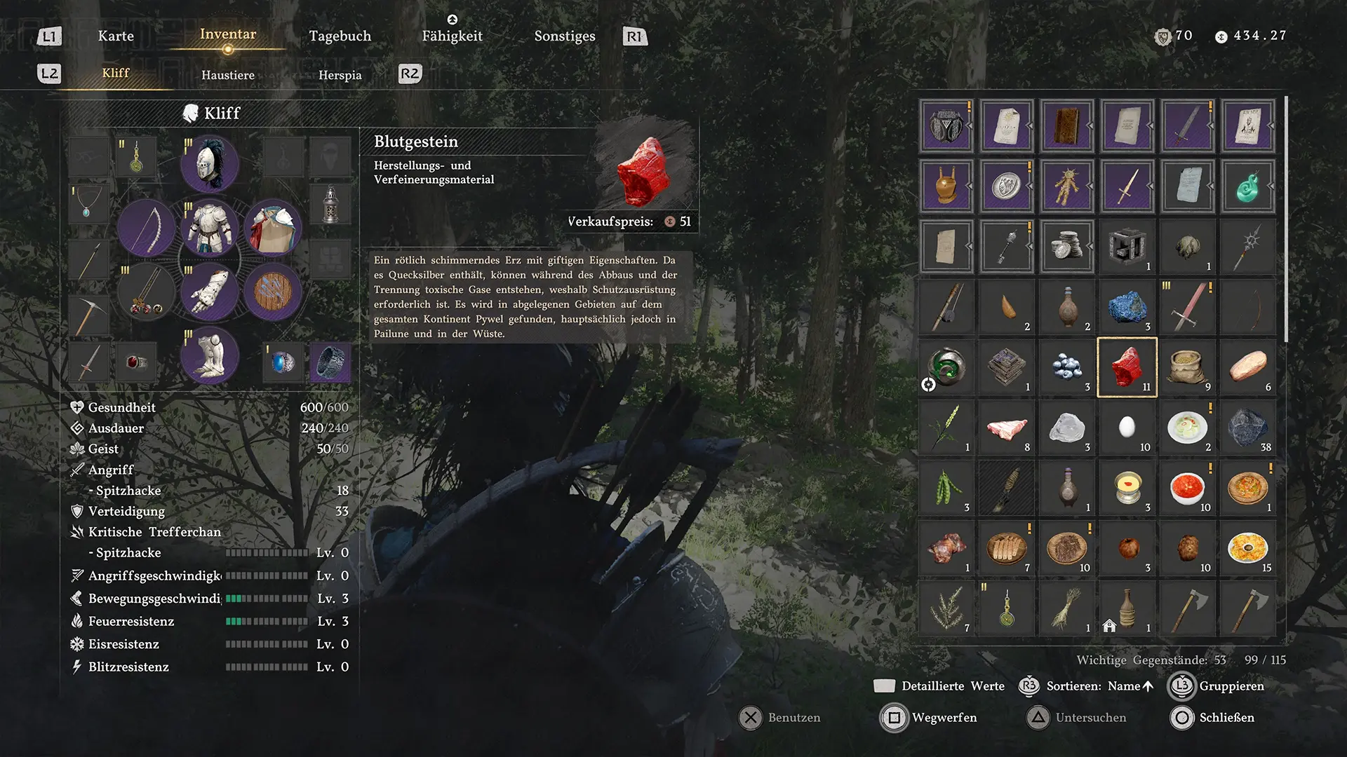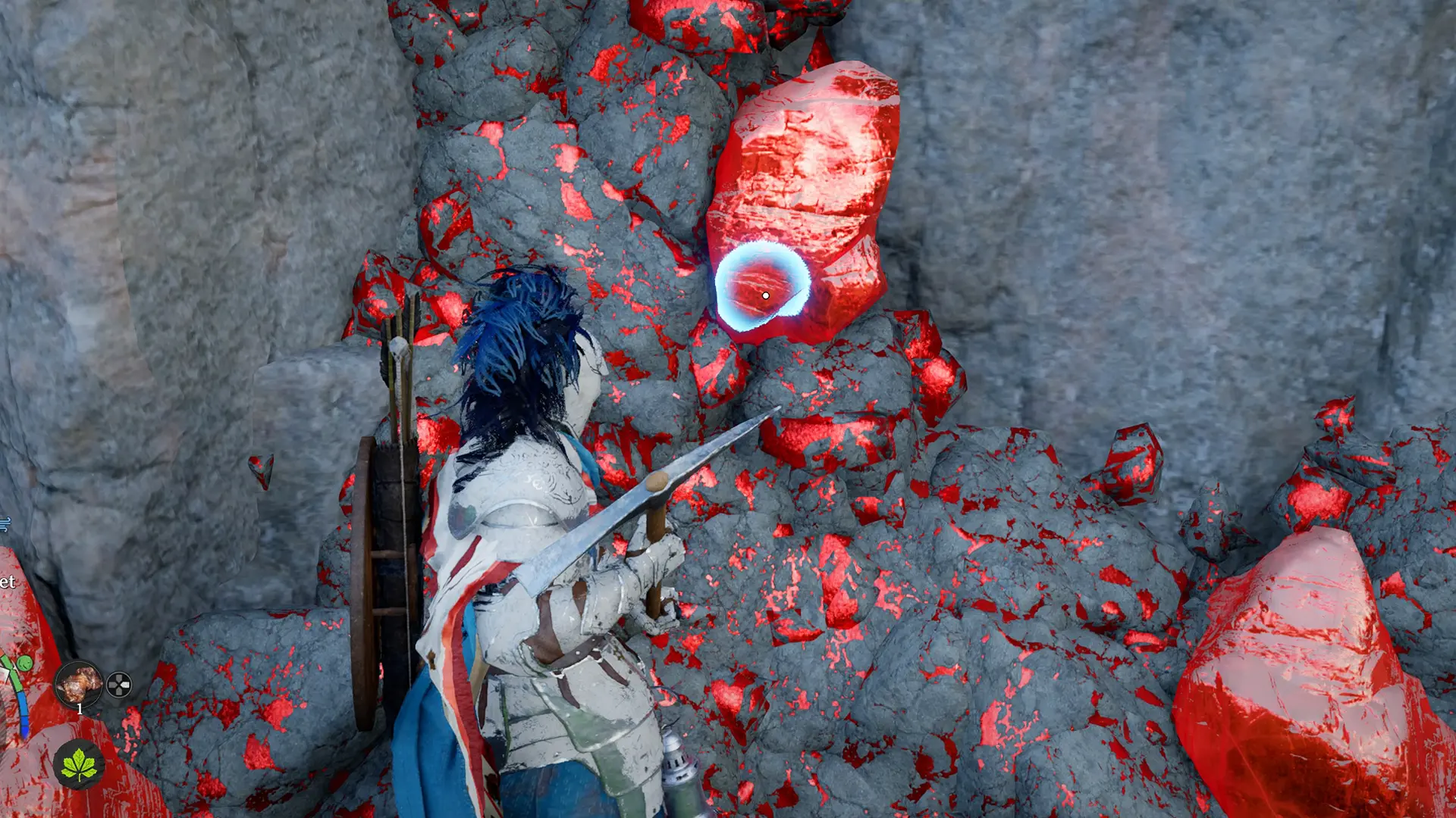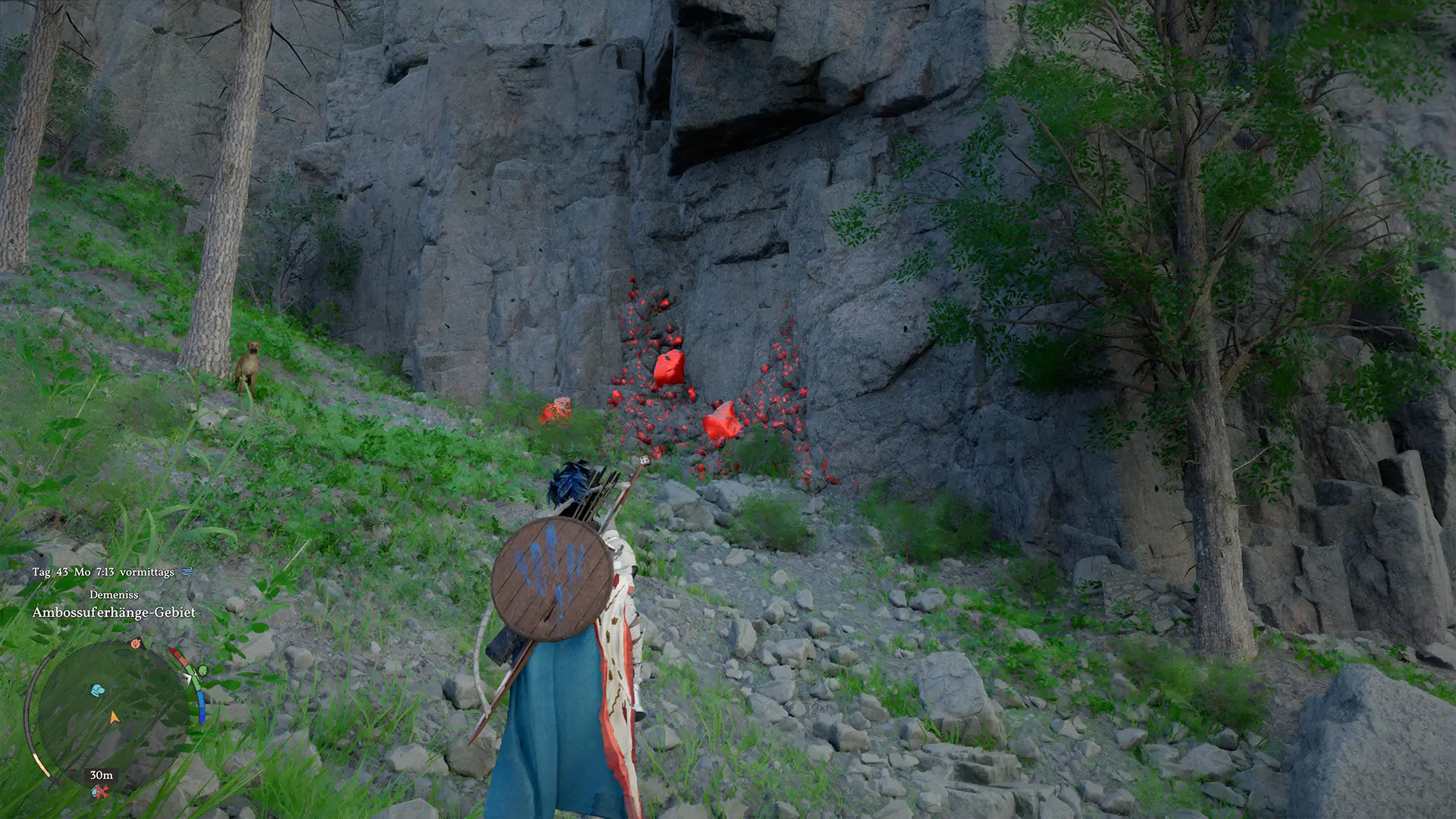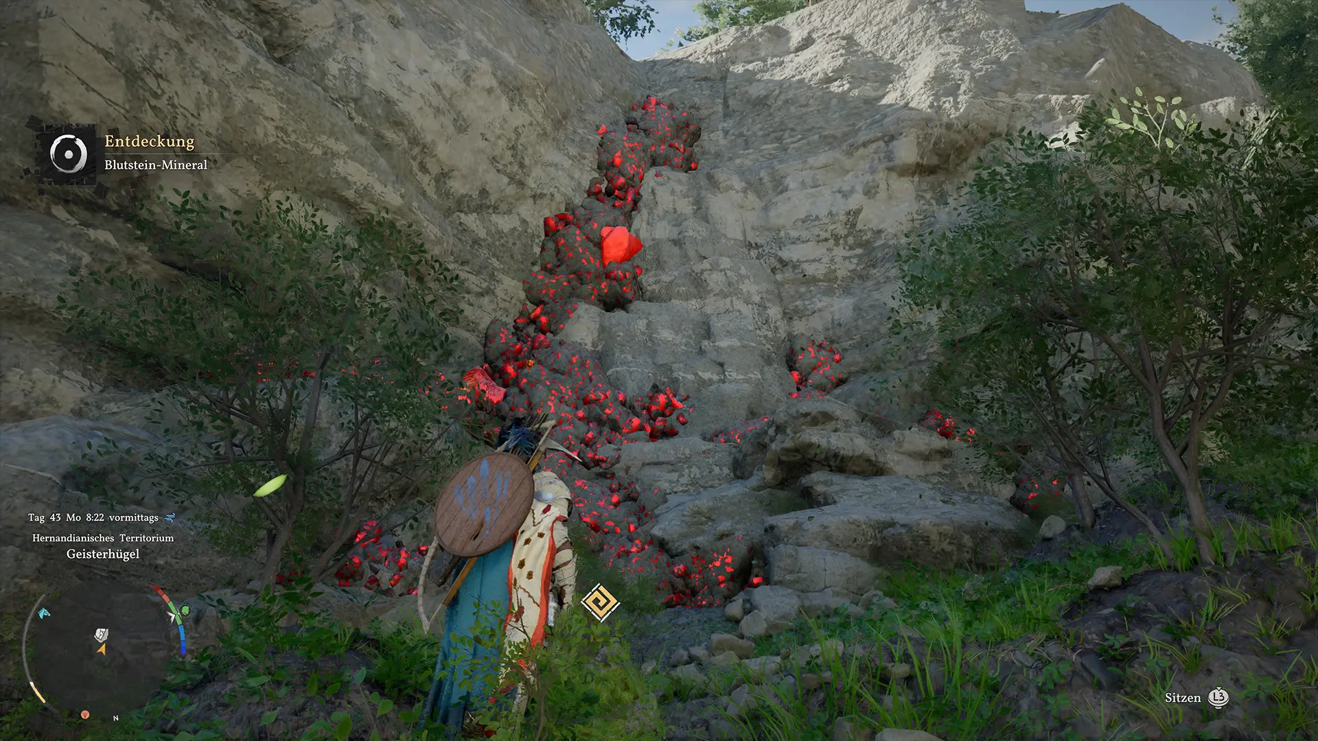 Bewege dich direkt nördlich des Heilhauses und überquere den Fluss. Auf der anderen Seite angekommen, solltest du den Fuß einer Felswand absuchen. Dort findest du eine Blutgestein-Ader, die sich gut sichtbar entlang der Wand zieht.