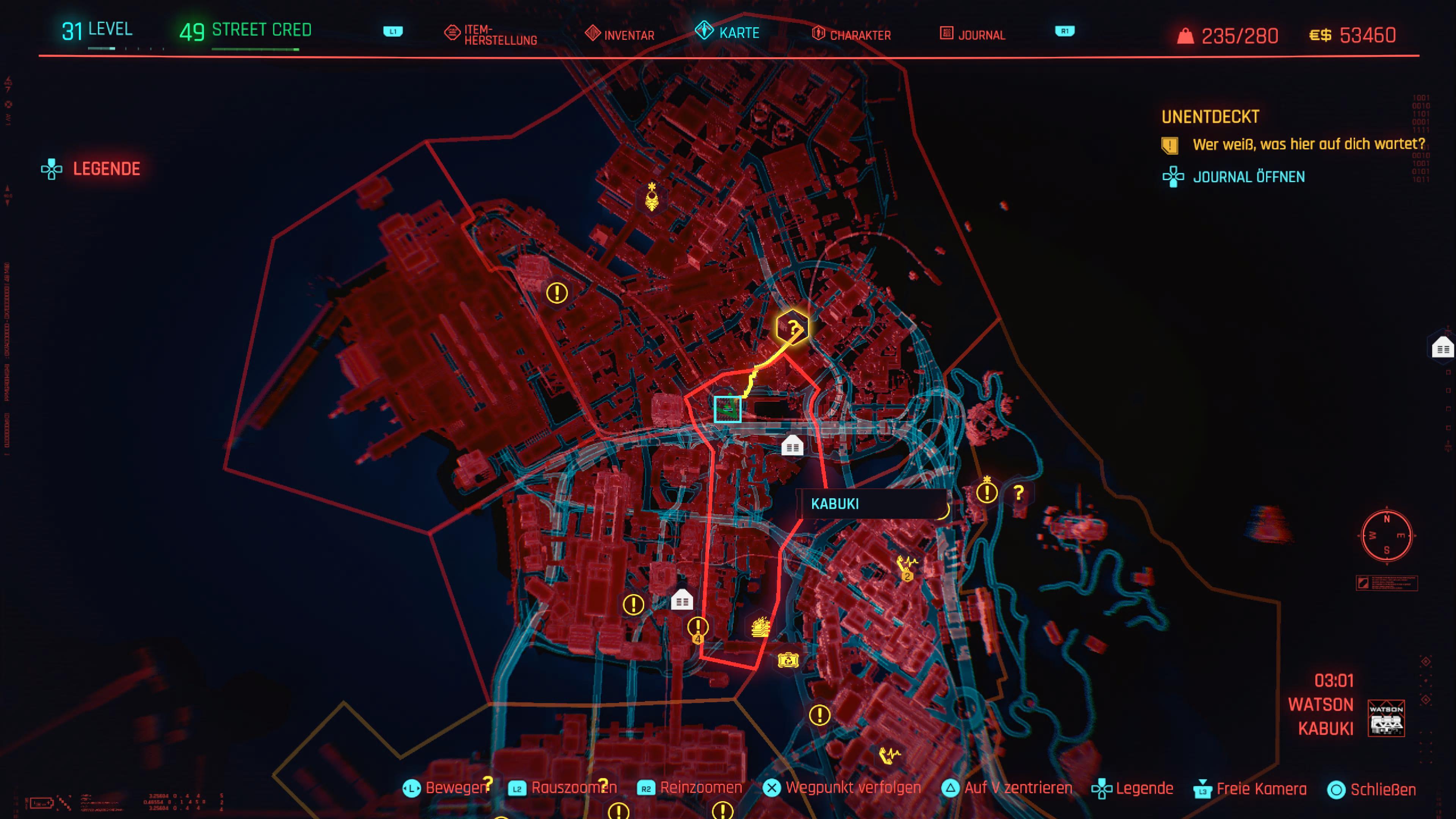Zuerst öffnet ihr die Karte. Der geheime Raum befindet sich beim Kabuki Markt im nördlichen Teil von Watson. Sucht also den nächsten Schnellreisepunkt auf und begebt euch zum Ziel: