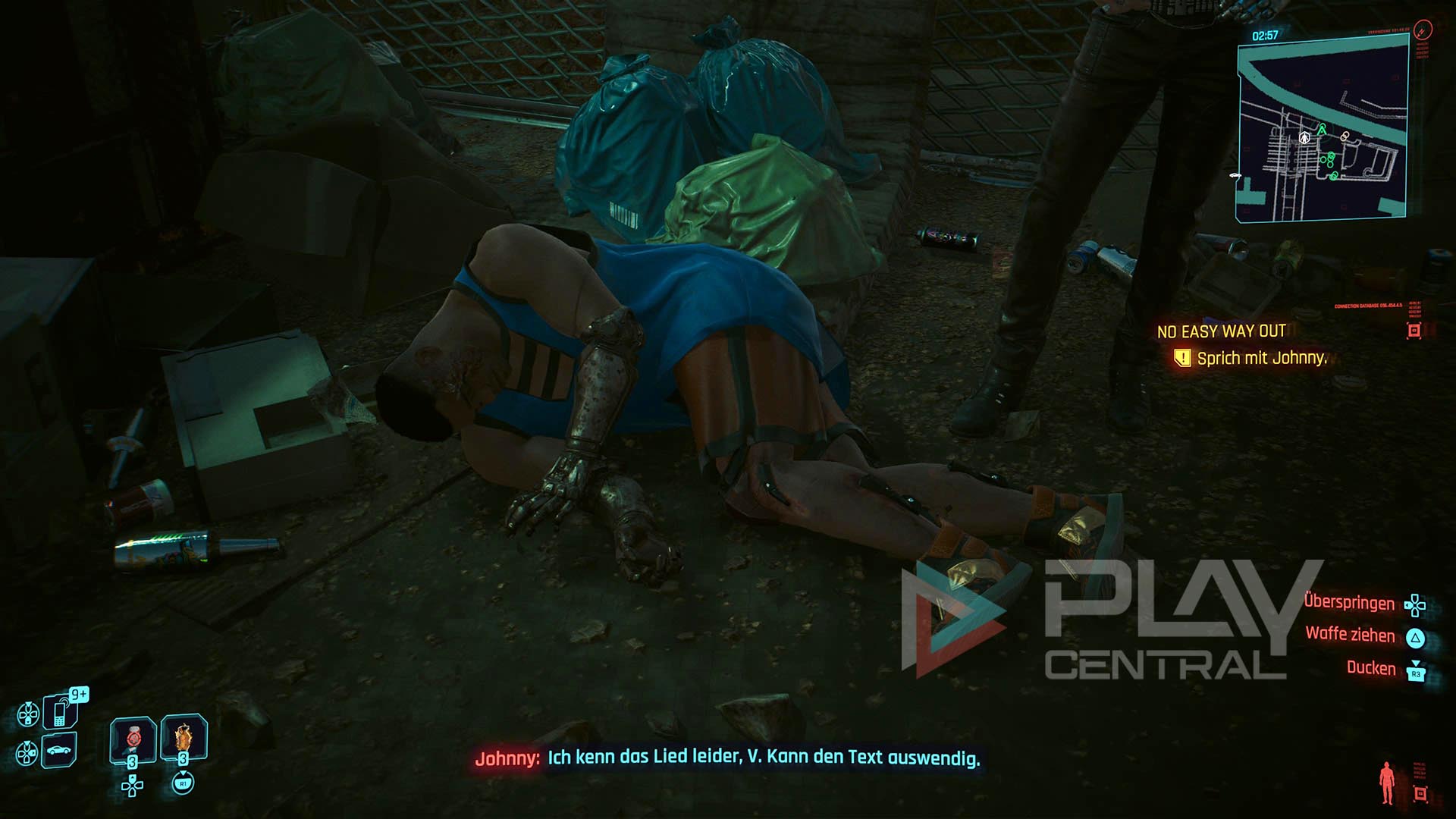 Er erzählt euch danach von einem Problem, bei dem er Vs Hilfe benötigt. Aaron will zu einem Scav namens Damir, der ihm helfen soll, bevor sein nächster Kampf beginnt. Also treffen wir uns an der Klinik in Terra Cognita.
