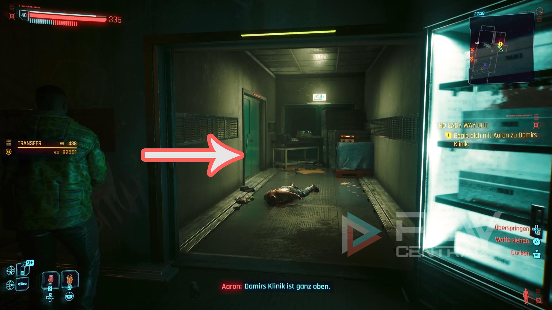 Im Inneren müsst ihr erst einmal ein paar Etagen nach oben gelangen. Auf halber Höhe könnt ihr einfach den Fahrstuhl verwenden. Ihr müsst so hoch es geht in die rechte, hintere Seite des Gebäudes. Hier wartet dann Damir, der Ripperdoc.