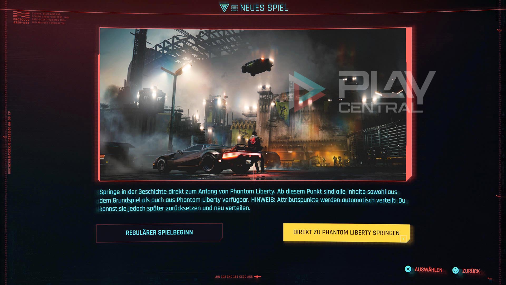 - Phantom Liberty direkt starten: Alternativ startet ihr direkt bei der Story von Phantom Liberty. Die Hauptgeschichte wird dann weitestgehend übersprungen.