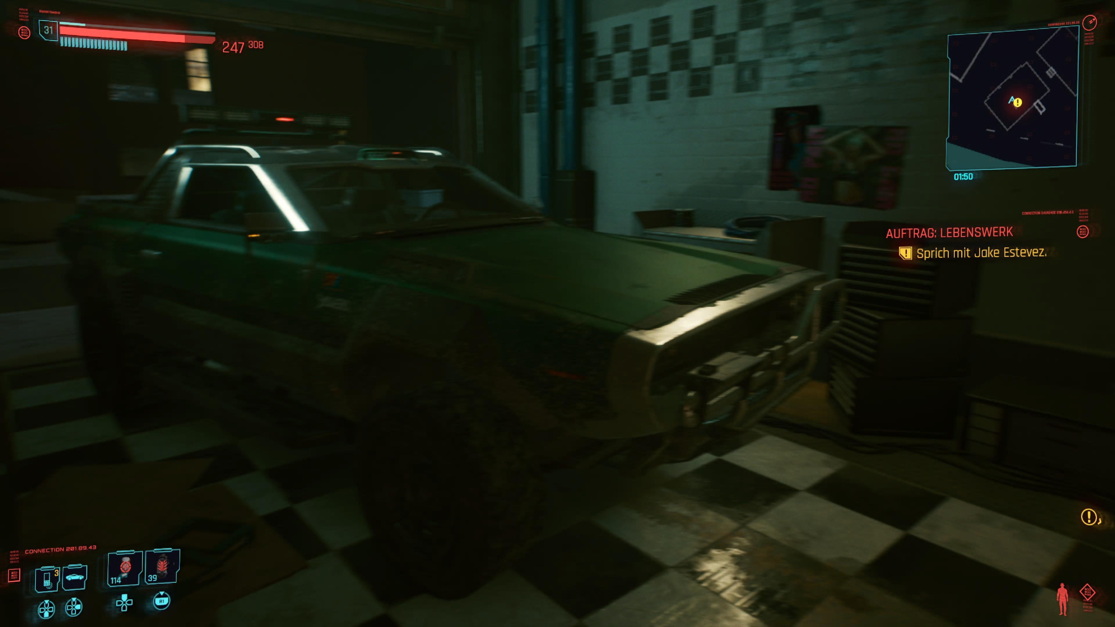 So oder so schaltet ihr erst einmal alle Feinde aus, räumt die halbe Werkstatt leer (so könnt ihr immerhin nebenher ein paar Eddies verdienen) und erst dann steigt ihr in das Auto, das in der unteren, rechten Hälfte (vom Eingang aus betrachtet) steht.