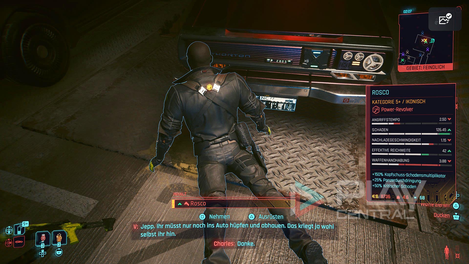 Falls ihr das trotzdem tut, beginnt ein Kampf gegen Dodger und seine Crew. Schaltet ihn aus und sammelt die Belohnung auf, die in diesem Fall die Waffe von Dodger darstellt. Es ist ein Power-Revolver namens Rosco. Schaut euch hier die Werte an.