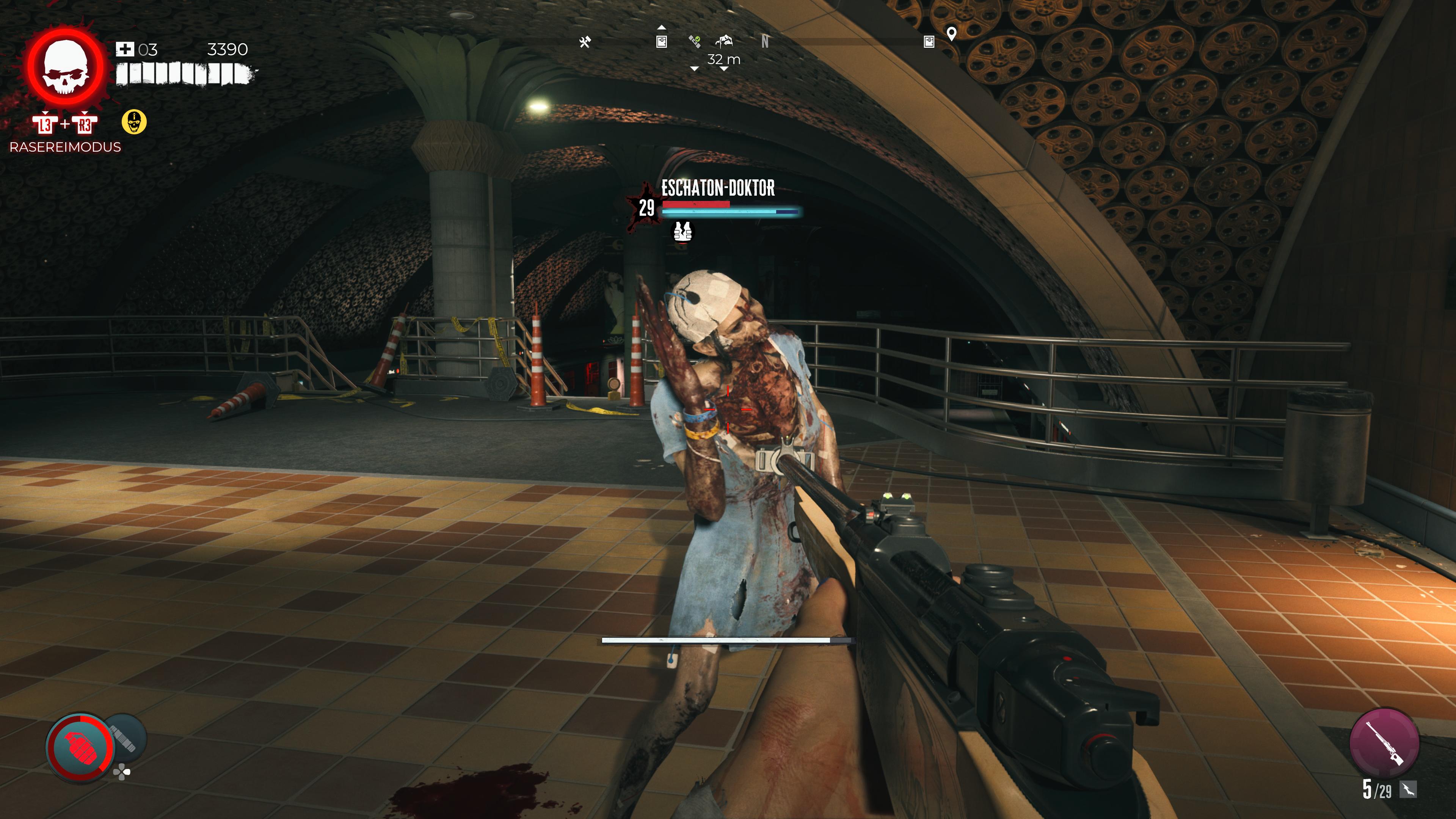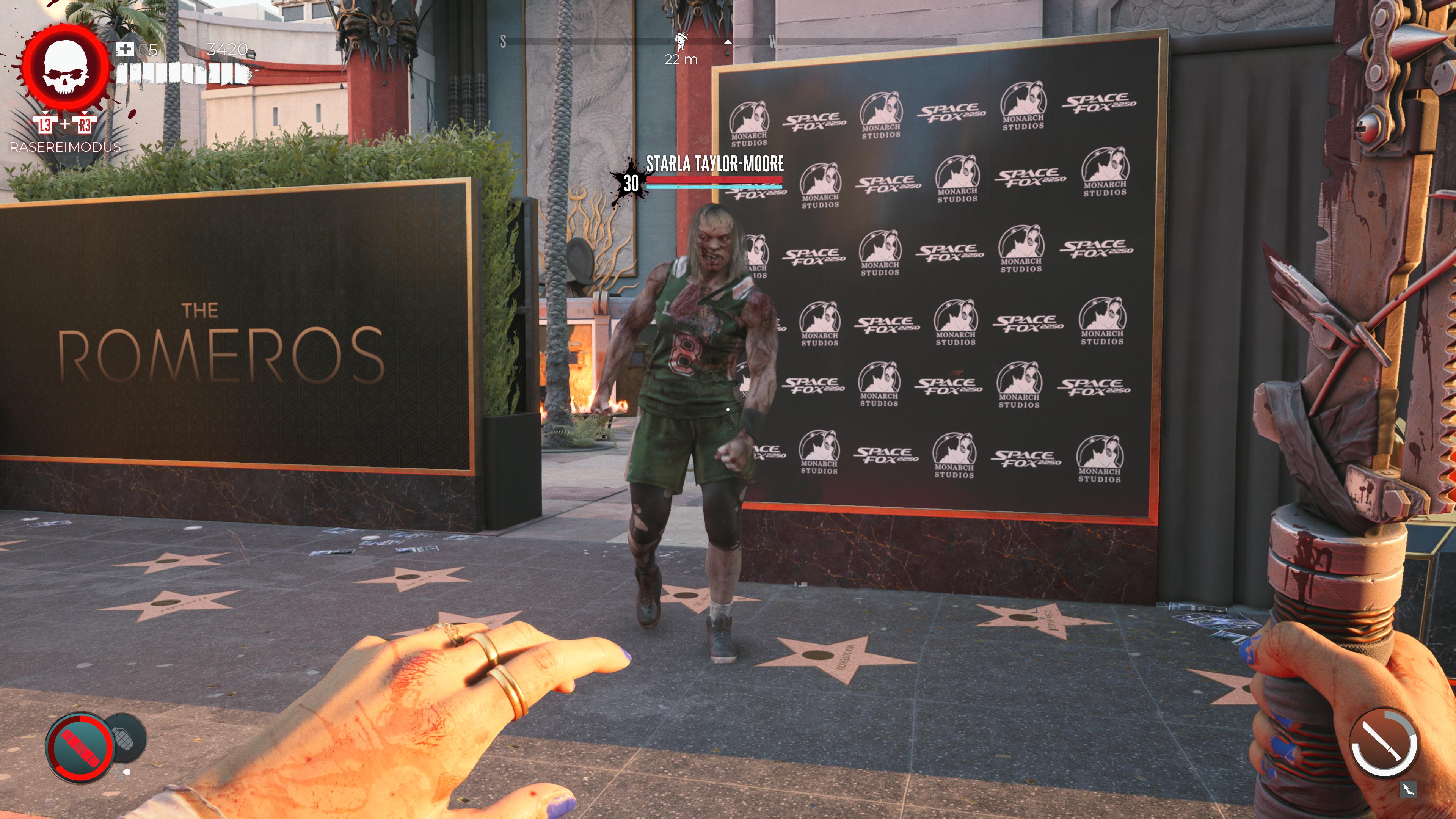 Schließt die hiesige Haupt-Quest ab, verlasst den Bezirk im Anschluss mindestens einmal oder ladet die Karte neu. Sucht dann nach dem namhaften Zombie hinter der Eventkonstruktion am Roten Teppich.