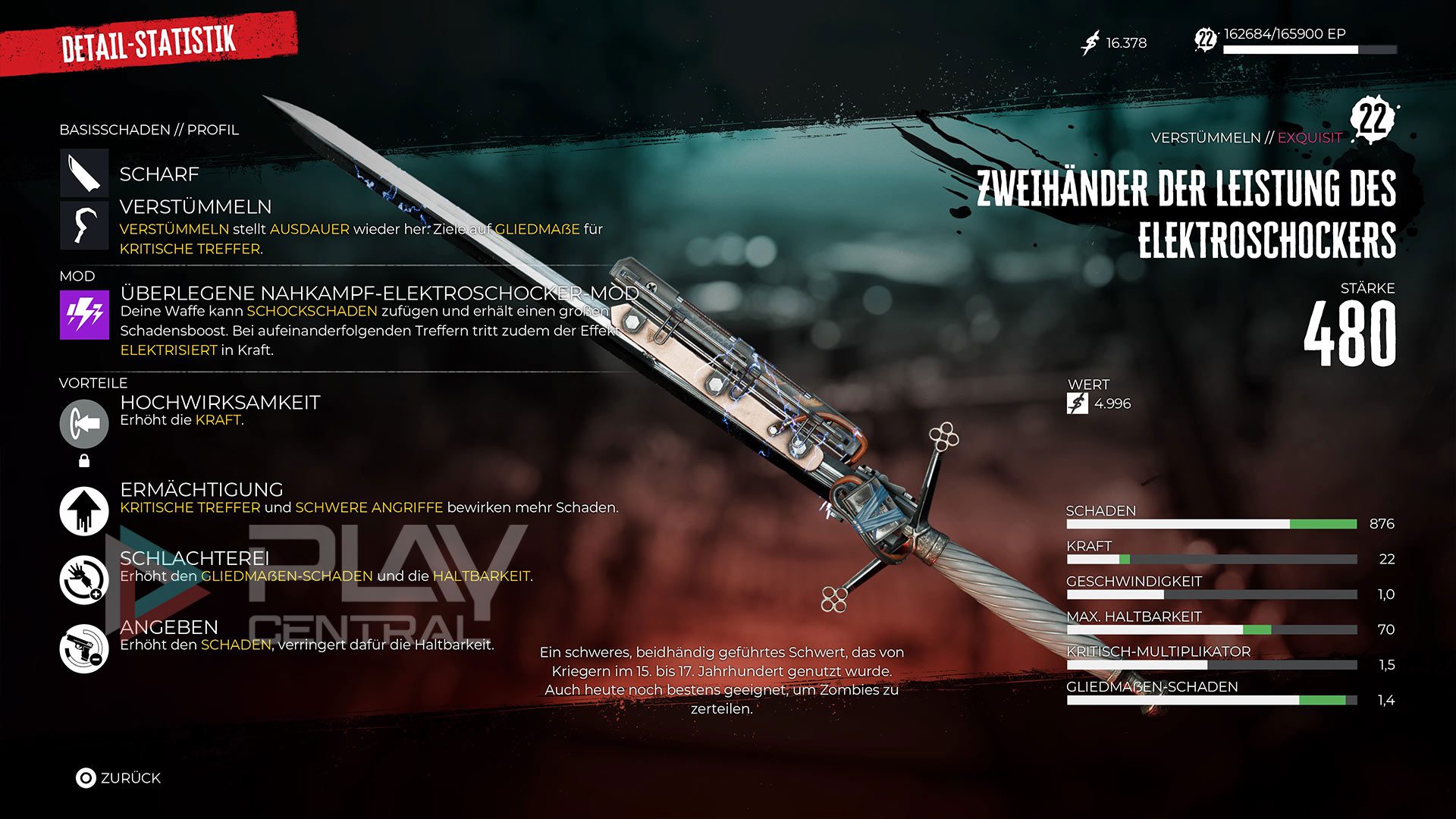 - Gliedmaßenschaden steht für den Schaden, den man üblicherweise Gliedmaßen von Zombies zufügt. Je höher der Wert, desto besser eignet sich die Waffe zum verstümmeln von Zombies.
