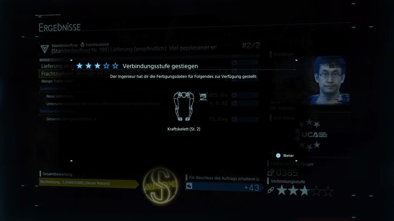 Sobald die Verbindungsstufe drei Sterne erreicht, schaltet ihr Level 2 des Kraftskeletts frei. Füllt ihr die Verbindungsstufe sogar auf vier Sterne (was nicht sehr lange dauert und nach rund sieben Aufträgen schon erreicht ist) werdet ihr mit dem Kraftskelett auf Level 3 belohnt.