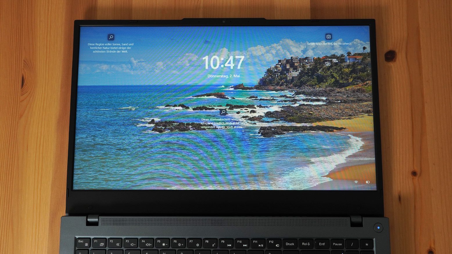 Habt ihr den Office-Laptop aufgeklappt, wird der Blick auf das matte 15,6-Zoll-Display, ein großzügig dimensioniertes Touchpad und eine beleuchtbare Chiclet-Tastatur mit Nummernblock frei.