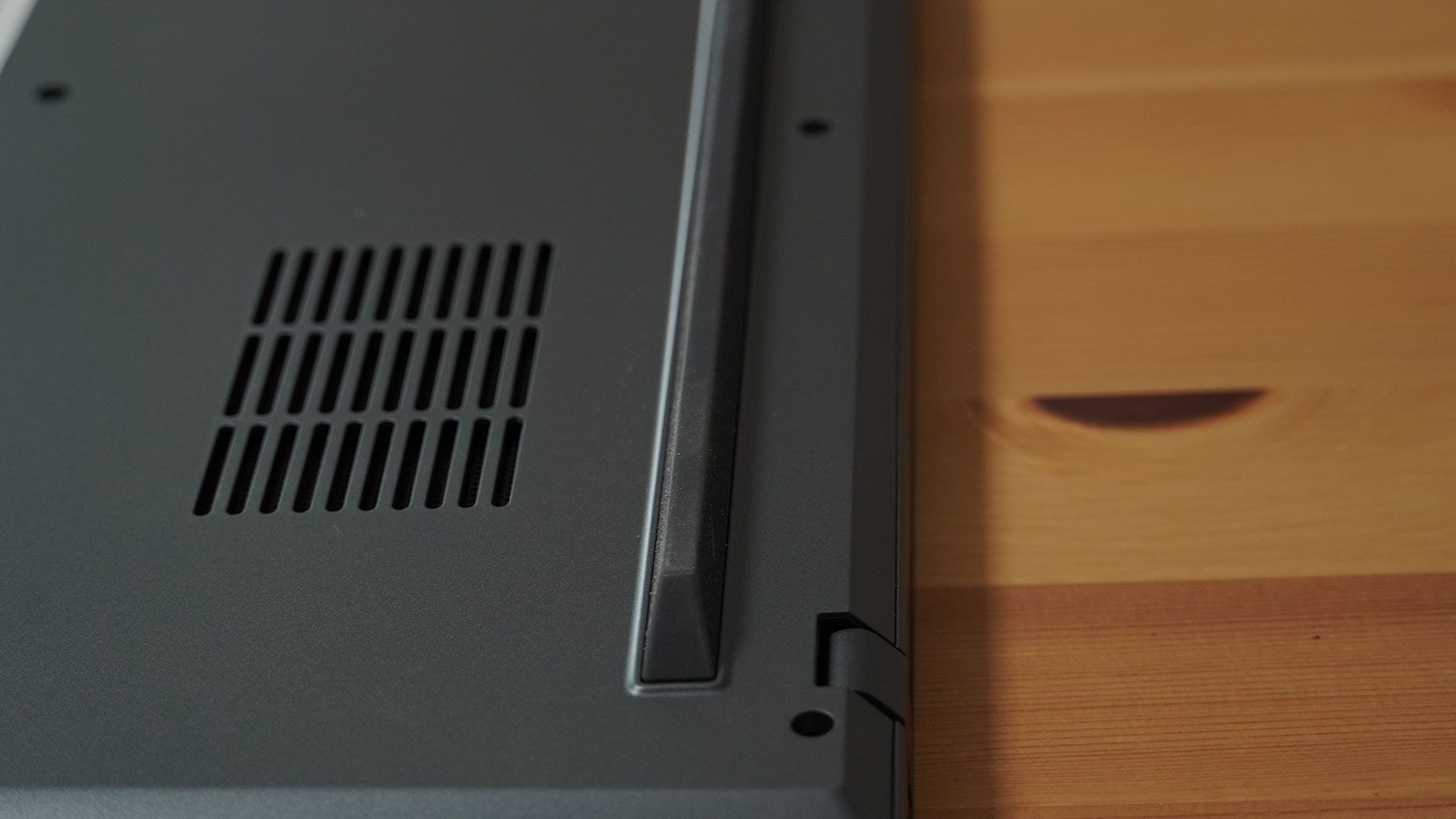 Das gesamte Gehäuse fällt sehr schlank aus und misst an der dicksten Stelle lediglich 2,4 Zentimeter. Mit 1,82 Kilogramm hat der Medion E15443 durchaus sein Gewicht, was aber keineswegs negativ zu betrachten ist. Denn so steht es in Kombination mit dem gummierten Standfuß auf der Rückseite, der sich über die gesamte Breite des Notebooks zieht, felsenfest und das auf so gut wie allen Untergründen.
