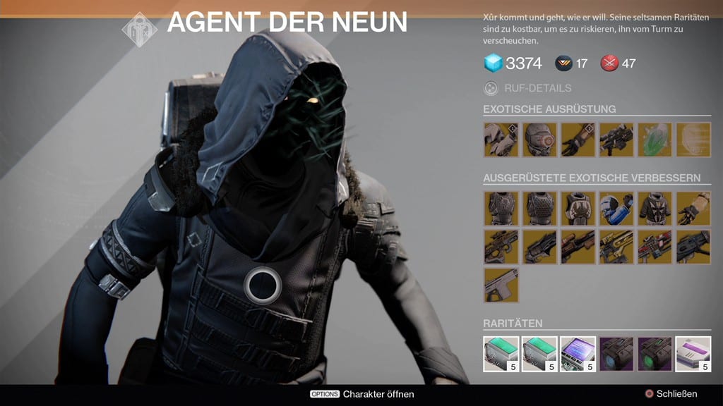 Zum einen ist es ein Glücksspiel, bis Xur mal euer Teil mit im Programm hat und da er nur von Freitagmorgen bis Sonntagmittag am Turm zu finden ist, müsst ihr euch beeilen und im Vorfeld schon alles parat gefarmt haben. Schmeißt ihr dann das Upgrade drüber, stellt ihr entsetzt fest, dass euer exotischer Gegenstand keine Aufwertungen mehr hat. Alles, was ihr im Vorfeld mühsam ergrindet habt, ist dann wieder weg. Das bedeutet, dass ihr von vorne beginnen müsst.