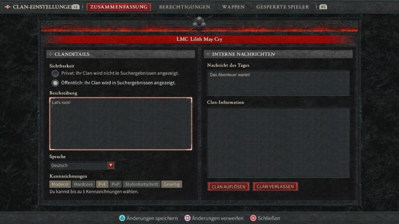 - Stellt die Sichtbarkeit, die Berechtigungen und das Wappen eures Clans ein