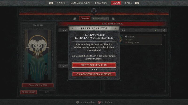 - Bestätigt den Menüpunkt „Clan erstellen“