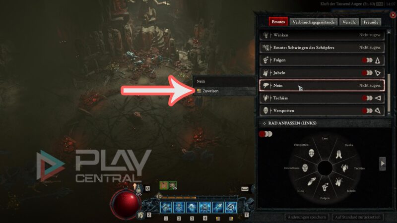 Das Emote, das wir benötigen, befindet sich gar nicht im Auswahlmenü. Was also tun? Es geht hier um das Emote mit dem Namen „Nein“. Geht also wie folgt vor: