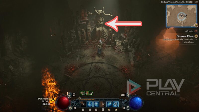 Jetzt könnt ihr euch vor die Statue stellen und einmal lautstark „Nein“ rufen, um Lilith zu entsagen! Es tut sich eine Truhe zu eurer Rechten auf. Das ist der Vorrat des Ketzers. Klickt drauf und sammelt alle Gegenstände ein.