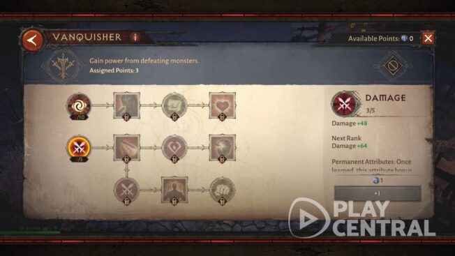 Davon werden 95 Punkte für passive Fähigkeiten ausgegeben, während 5 Punkte für Skill-Spezialisierungen herhalten. Diese sind nur dann aktiv, wenn auch der Skill-Tree aktiv ist. Aber die Attribute sind permanente Verbesserungen, unabhängig vom ausgewählten Talentbaum.