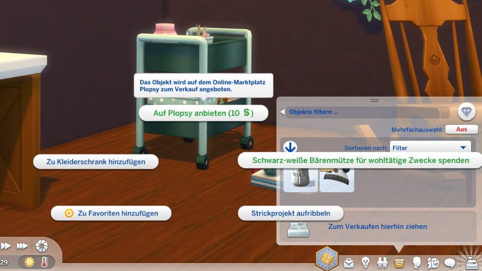 Aber was ist mit der allgegenwärtigen Nutzung von Online-Verkaufsplattformen wie Etsy und Co? Plopsy (die dezente Ähnlichkeit zu Etsy könnte auffallen) ist die zeitaktuelle Sims-Form davon und lässt sich ganz einfach über die hergestellten Gegenstände nutzen. Wählt hier einfach Auf Plopsy anbieten und schon wird gegen eine geringe Gebühr ein möglicher Käufer für euer Verkaufsobjekt gesucht.