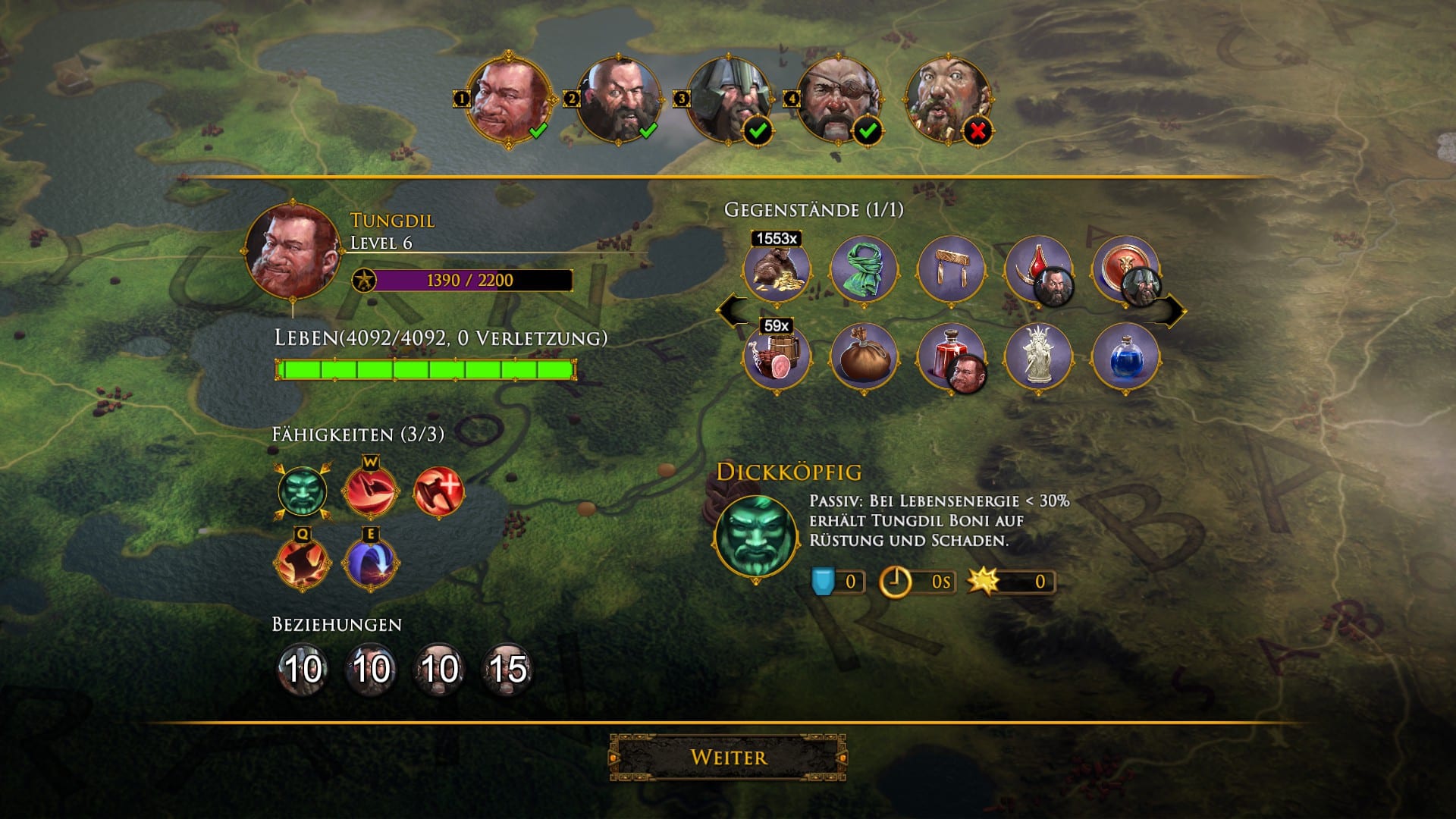 Neben einem gemeinsamen Ziel teilt sich eure Gruppe ebenfalls ein gemeinsames Inventar, eigene Charakterslots gibt es nicht. Vor Beginn eines Kampfes könnt ihr jedem Helden ein Item oder einen Trank zuweisen, der während des Kampfes benutzt werden kann, Individualisierung der Charaktere ist hier aber, abgesehen von den frei wählbaren Fertigkeiten, bis zum Erreichen des maximalen Levels zehn, nicht möglich. Für ein Fantasy-Abenteuer eher ungewöhnlich, dennoch eine logische Schlussfolgerung, bedenkt man die Literaturvorlage. Man entwickelt bei Die Zwerge keinen eigenen Charakter, sondern wird durch die Augen und Taten des Protagonisten direkt in die Geschichte integriert. Oder könnt ihr euch an ein Buch erinnern, in dem die Helden nach jeder erfolgreichen Schlacht erst einmal jede Leiche durchsuchen und Stunden mit dem Vergleichen der Vorzüge verschiedener Rüstungen und Waffen zu verbringen, nur um sich nach dem näcshten Kampf wieder direkt neu einzukleiden?