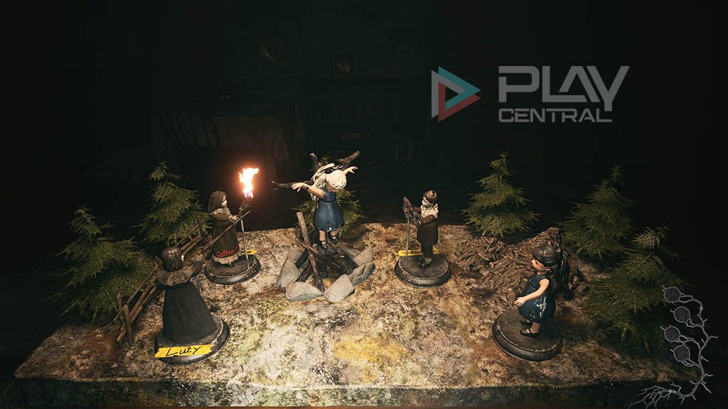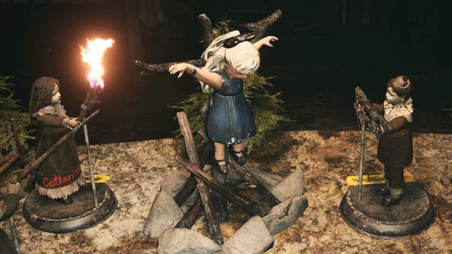 Mit der vierten Puppe, die aussieht wie Rose mit schwarzen Haaren, laufen wir dann wieder zurück zur Werkstatt, wo es ans Eingemachte geht. Wir müssen das Lagerfeuer entzünden. Rose soll brennen.