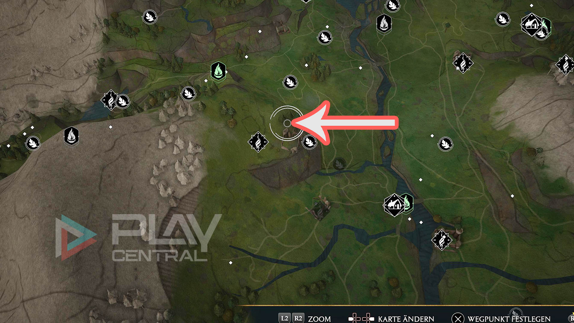 Am besten spawnt ihr beim Fort im Westlichen Tal von Hogwarts. Von da aus ist es nur noch ein Katzensprung in Richtung Südosten. Der Diricawlbau befindet sich am oberen Ende der Ruine.