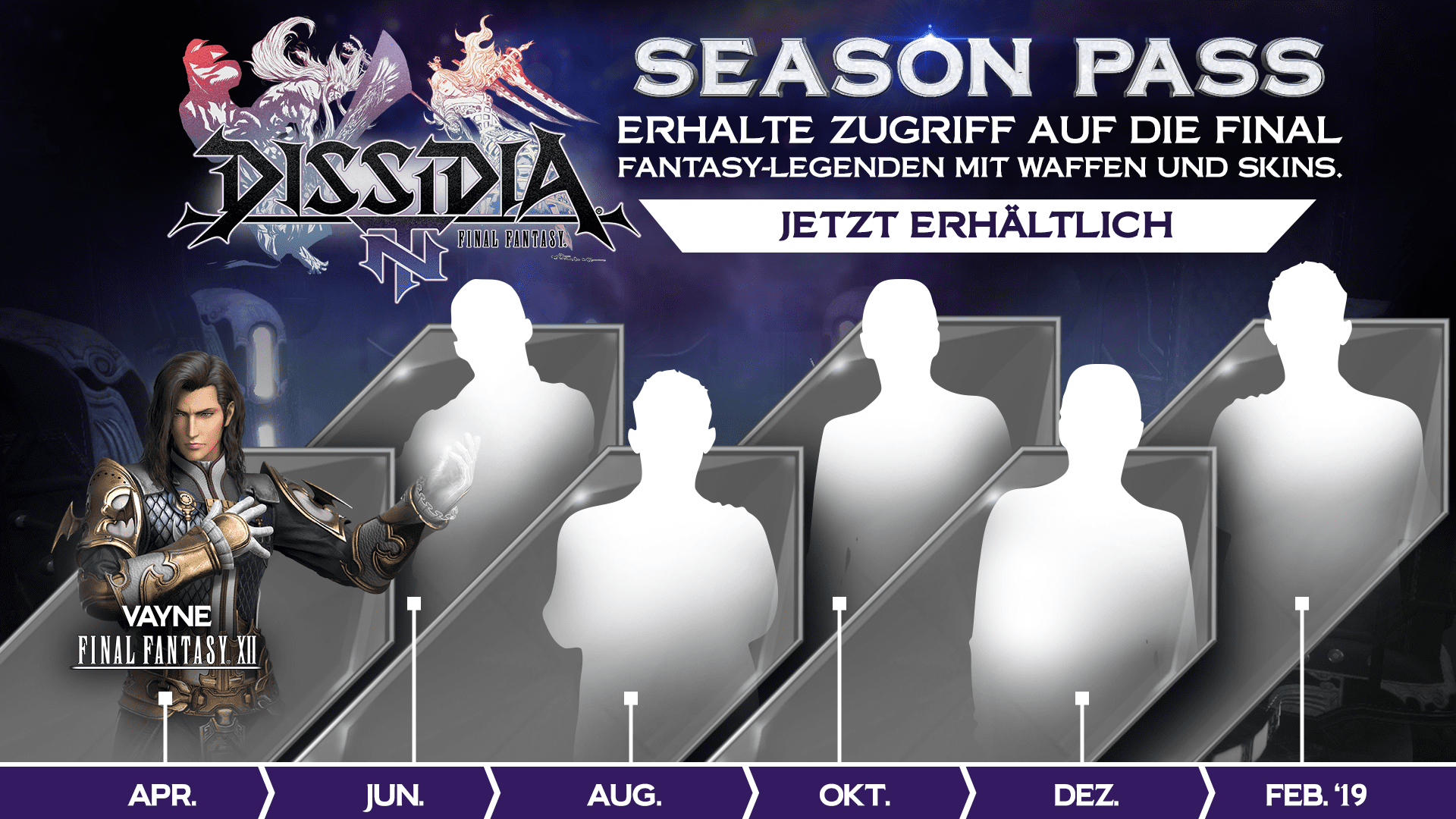 Falls ihr noch nicht wisst, ob sich ein Season Pass lohnt, dann müsst ihr abwägen. Insgesamt werden nämlich sechs Kämpfer nach und nach veröffentlicht. Somit ist Vayne, der im April erscheint, lediglich der erste Charakter. Die Streiter kommen jeweils mit unterschiedlichen Waffen und Kostümen daher, sodass hier ein wenig Abwechslung auf dem Schlachtfeld zu sehen sein wird. Zudem dürft ihr euch über den digitalen Mini-Soundtrack freuen, der über fünf Tracks verfügt, die aus Dissidia Final Fantasy NT und der Arcade-Version Dissidia Final Fantasy stammen.