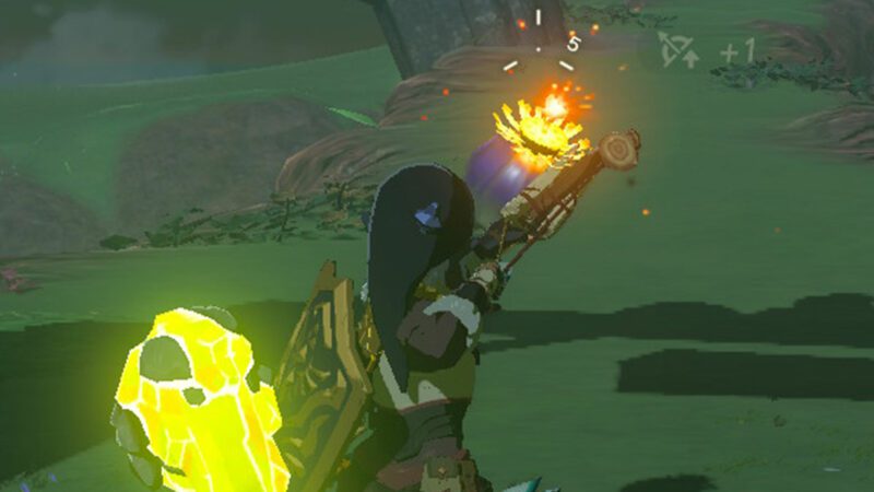 Habt ihr im Inventar einen Bogen ausgewählt, zielt auf einen Gegner und haltet dann die Pfeiltaste nach oben gedrückt. Mit dem rechten Analogstick könnt ihr jetzt die Donnerblume auswählen, wodurch diese an eurem aufgelegten Pfeil befestigt wird. Lasst die ZR-Taste wieder los, um den Pfeil zu verschießen. Dadurch habt ihr deutlich mehr Reichweite, um der verheerenden Explosion des Bombenpfeils zu entgehen und letztendlich nur euren Gegnern Schaden zuzufügen.