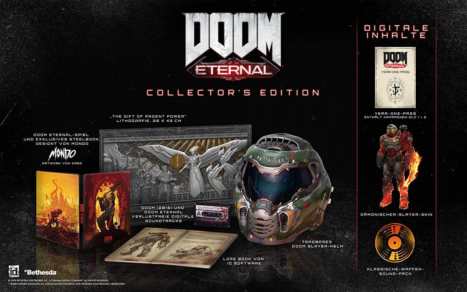 Die Collector's Edition umfasst eine große Lithographie, einen tragbaren Doom-Slayer-Helm, ein Lorebuch, einen Soundtrack, ein Steelbook sowie diverse digitale Inhalte.