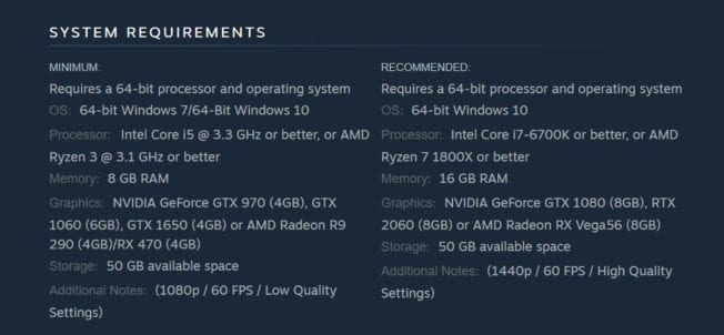 Auf der offiziellen Shop-Seite von Doom Eternal auf Steam waren kurzzeitig die minimalen sowie empfohlenen Systemanforderungen für die PC-Version gelistet. Mittlerweile sind diese allerdings wieder entfernt worden. Unter dem Punkt „Systemanforderungen“ sind nun lediglich das Betriebssystem sowie die Prozessorarchitektur angegeben. Der Branchen-Insider Nibel konnte von den Angaben jedoch einen Screenshots anfertigen und diesen auf Twitter teilen: