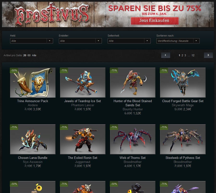 Der vorübergehende Spielmodus dürfte aber nichts sein, das bei allen hartgesottenen Dota-Fans gleichermaßen punkten kann. Valves Weihnachtspaket umfasst daher nicht nur leere Bits und Bytes, sondern Inhalte hinter den Türchen des Kalenders. Das Ranked Matchmaking hatte man erst vor kurzer Zeit ins Gespräch gebracht und prompt geliefert. Optimierungen an der Einsteiger-Erfahrung von Neulingen zaubern neben Schritten, um das Gefühl des Zusammengehörens unter Freunden zu stärken, ein Lächeln auf die Lippen. Auf einen richtigen Kracher stoßen Besitzer eines Steam-Accounts gar im Shop der MOBA. Ganz im Zeichen des von Valve in alter Tradition praktizierten Weihnachtsausverkaufs präsentiert sich nämlich auch der Dota-Laden. Unzählige Gegenstände verlieren bis zum 4. Januar 2014 bis zu 75 Prozent ihres Originalpreises. Einen Vorwurf kann man den Entwicklern nicht machen, zumal sie bereits im November ein großes Update über die Bühne brachten und auf die Sehnsüchte nach der Rückkehr des Diretide-Events mit Spontanität und raschen Entwicklungsarbeiten reagierten.