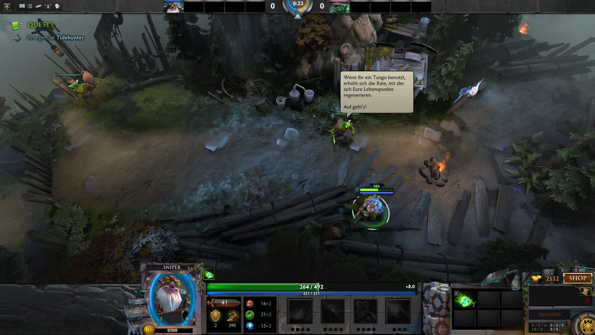 Einen geglückten Einstieg versucht das mehrstufige Tutorial schon zu Anfang sicherzustellen. Umgeben von einem nebensächlichen Handlungsstrang prügeln Neulinge auf erste Kreaturen ein und bringen Fähigkeiten zum Einsatz. Leicht zu meistern ist Dota 2 dabei keineswegs. Die Einführung aber verhindert einen Wurf ins kalte Wasser und macht mit Steuerung und Spielprinzip vertraut. Gar Profis können hier noch etwas lernen, weshalb die Übungseinheiten in Dota 2 sich nicht als Tutorial, sondern als Training bezeichnen. Nach Hunderten gewonnenen Spielen lohnt sich etwa nach wie vor die Absolvierung des Last-Hit-Trainings, das einen die gezielte Tötung der Creeps verinnerlichen lässt und damit zu einem stetigen Goldfluss in den tatsächlichen Spielen verhilft.