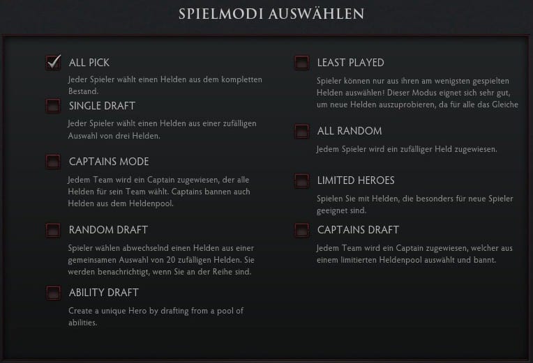 Steht einem der Sinn danach, den Umgang mit weiteren Figuren zu erlernen, so muss man auch nicht auf einen Kampf gegen Bots ausweichen oder sich in einer Partie gegen andere Spieler zum Bauernopfer machen. Statt des regulären Spielmodus, der alle Spieler nach Belieben einen Champion wählen lässt, weicht man lediglich auf die „Least-Played“-Variante aus. Weil Dota 2 genauestens Buch über die eigene Spielgeschichte führt und erkennt, wie oft ein Held mit einem Account verwendet wurde, kann in diesem Modus jeder nur zwischen den Helden wählen, die er überhaupt nicht beherrscht. Gleiche Chancen für alle also. Neben diesen beiden Modi verwöhnt Dota 2 mit sieben weiteren Variationen. Etwa mit der Kategorie „Limited Heroes“, die nur anfängerfreundliche Helden zulässt. In „Ability Draft“ mischen sich Spieler ihren eigenen Helden aus einem Pool an Fertigkeiten zusammen.