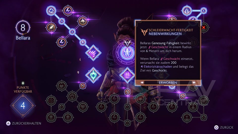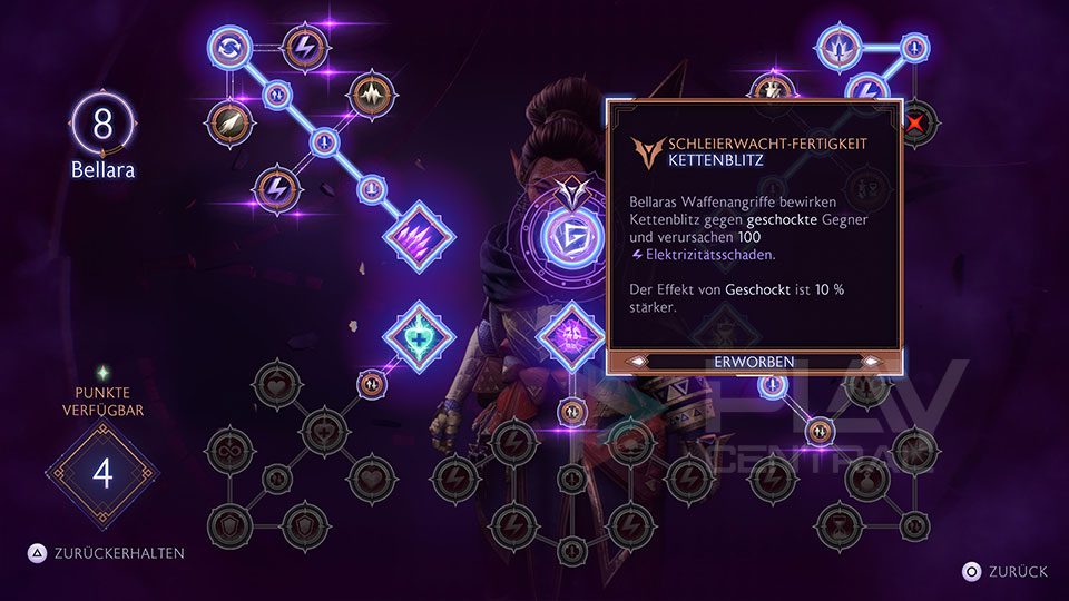 • Schleierwacht-Fertigkeit – Kettenblitz: Bellaras Waffenangriffe bewirken Kettenblitz gegen geschockte Gegner und verursachen 100 Elektrizitätsschaden. Der Effekt von Geschockt ist 10 % stärker.