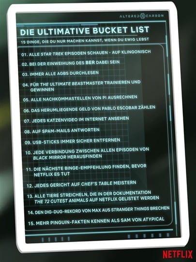 Mal angenommen der Mensch könnte ähnlich wie in der Netflix-Serie Altered Carbon ewig leben, welche Dinge würden dann ganz sicher auf einer To-do-Liste landen?