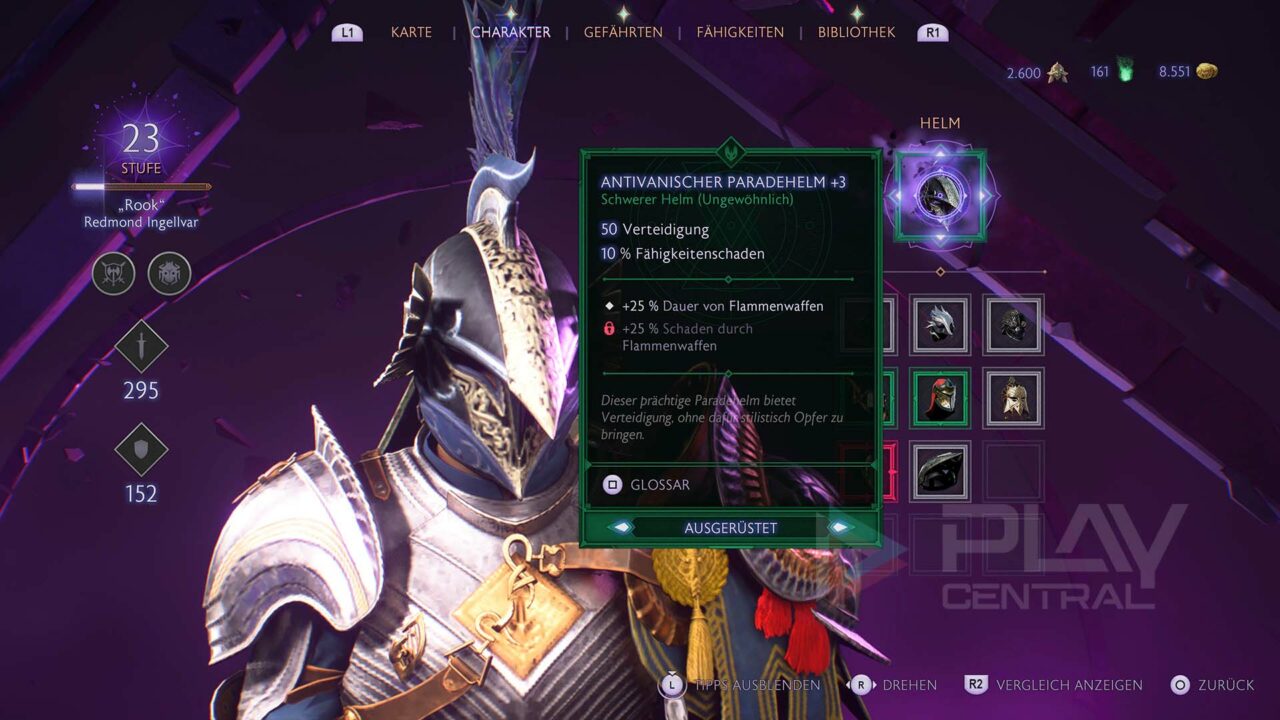 Dieser Helm eignet sich bestens: Ein Antivanischer Paradehelm stärkt in seinen Fähigkeiten deine Flammenwaffen. Das sind die Werte, auf die du bei der Wahl deiner passenden Rüstung wertlegen solltest.
