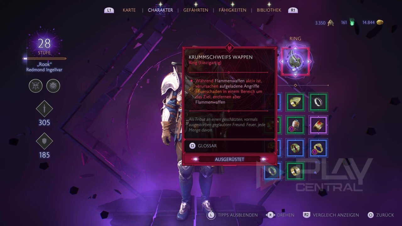 Außerdem eignet sich Krummschweifs Wappen, den ich für diesen Build sogar explizit empfehlen möchte. Dieser Ring verursacht Feuerschaden in einem Bereich um dich herum, wenn du mit Flammenwaffen und einem aufgeladenen Angriff attackierst. Kurzum, tödlich! Diesen speziellen Ring erhältst du am Ende dieser Lösung.