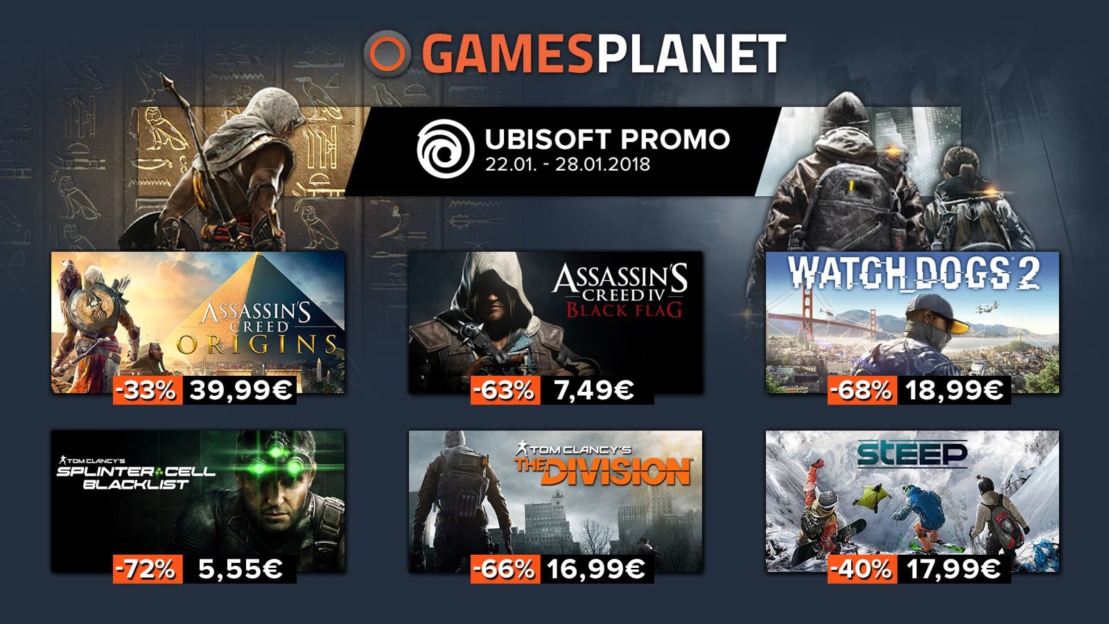 Aber das ist noch nicht alles, denn bei Gamesplanet gibt es aktuell noch viele weitere Hammer-Angebote zu entdecken. Ubisoft hat viele Hits stark reduziert und bietet euch bis zu 70 Prozent Rabatt! Mit dabei sind unter anderem die folgenden Games: