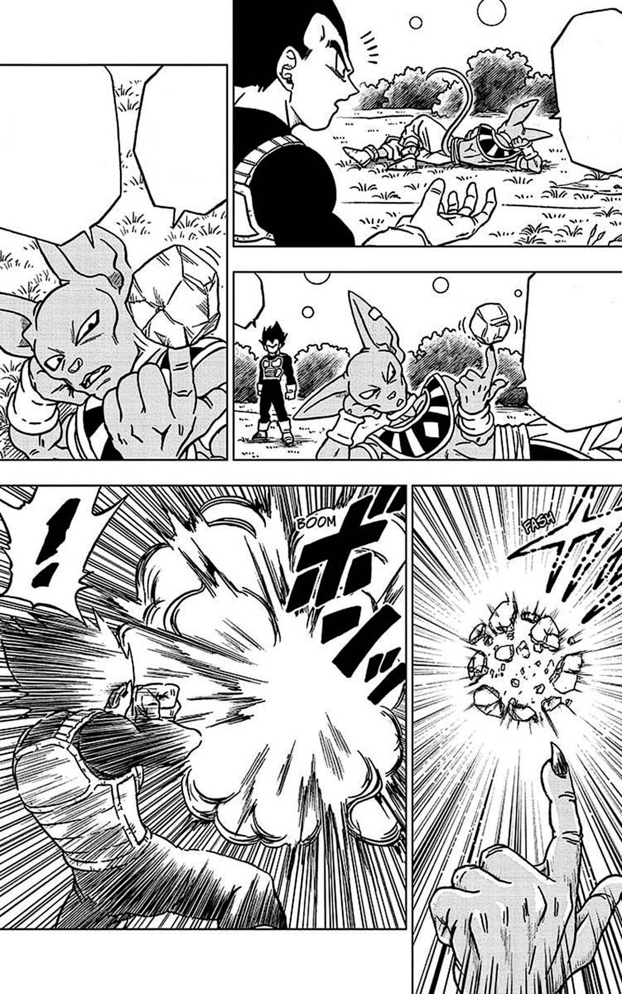 Anhand dieser Explosion könne Vegeta also erkennen, ob er die „Zerstörung“-Technik der Götter auch korrekt ausführe. Kurz nach dieser Erklärung gelingt es dem Prinz der Saiyajin tatsächlich, zumindest einen kleinen Kiesel zu zerstören. Sein Fortschritt bleibt natürlich auch Son-Goku und Whis nicht verborgen. Zuversichtlich wie eh und je verspricht Vegeta, schon bald werde er sehr viel größere Dinge zerstören können.