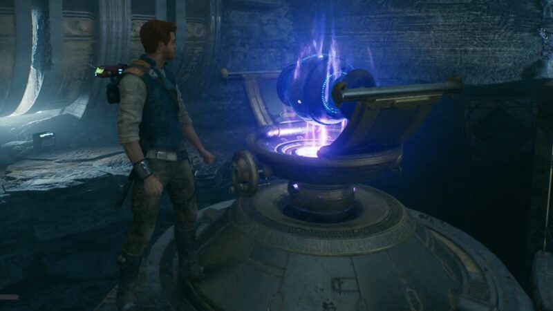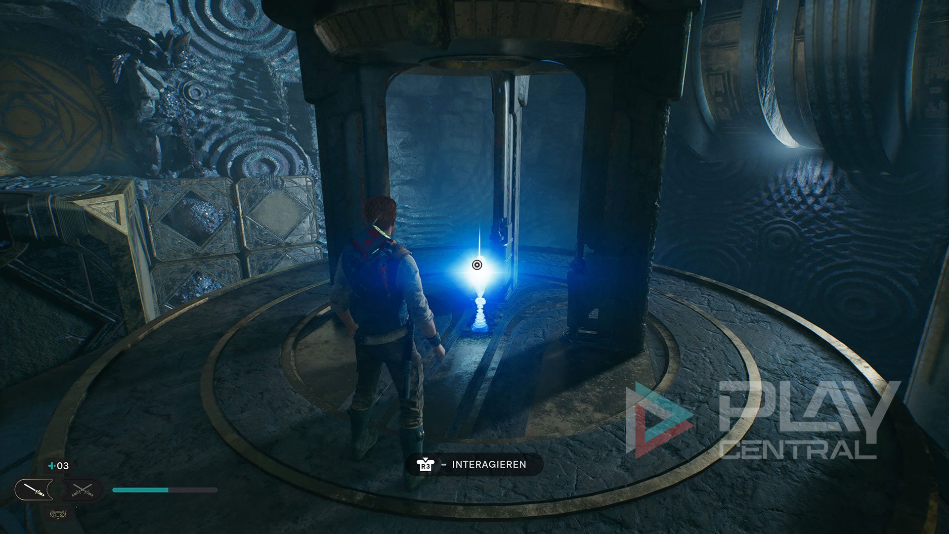 Nachdem ihr einige Wandläufe hinter euch gebracht habt, steht ihr bereits inmitten der Kammer. Direkt vor euch wird euch eine blaue Kugel ins Auge fallen. Diese könnt ihr mit Hilfe der Macht in den Kugelkoppler zu eurer Rechten befördern, wodurch sich neben euch eine Brücke aus Koboh-Staub bildet. Nutzt die Brücke, um auf die andere Seite zu gelangen.