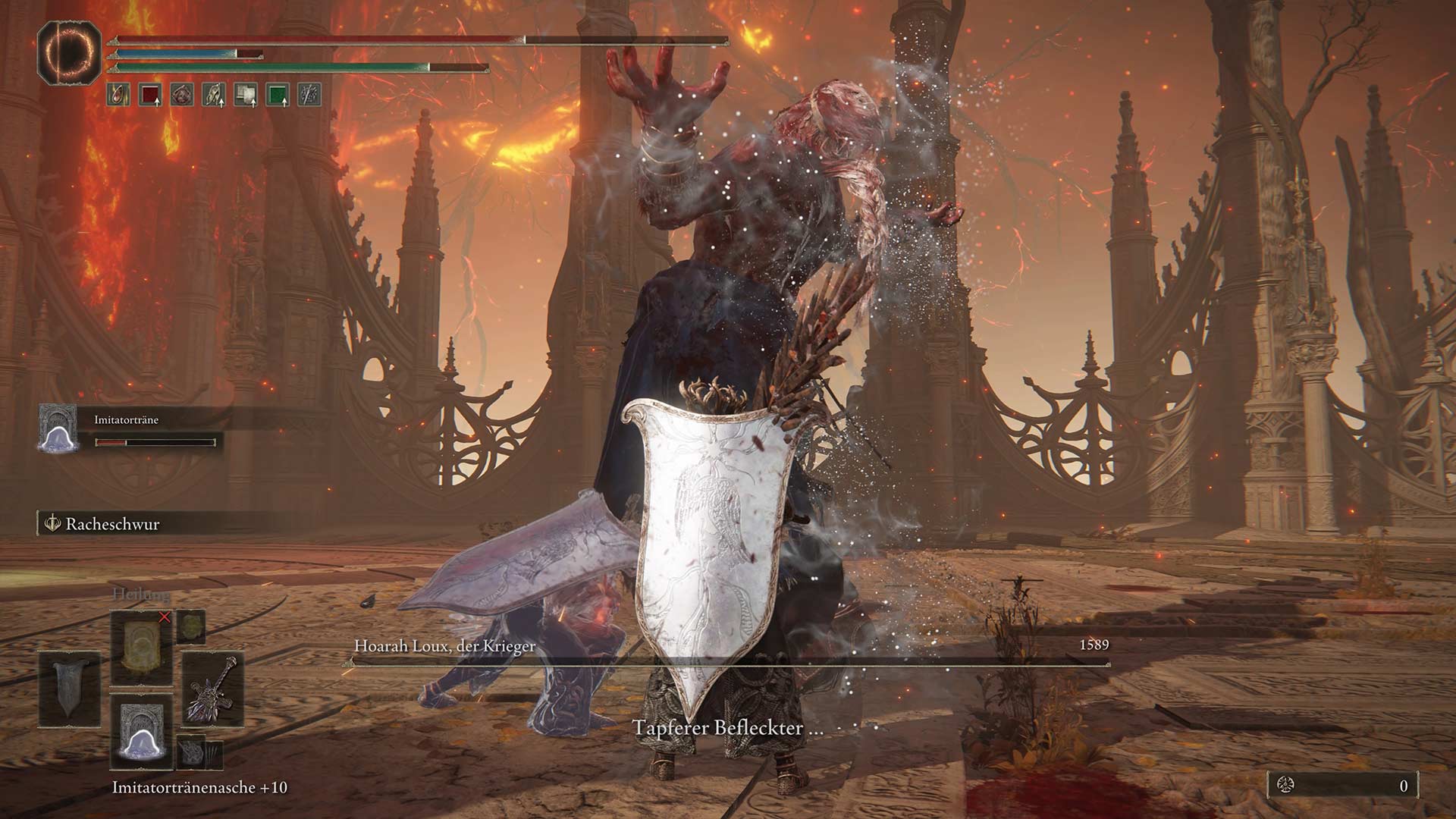 Zudem haben die Attacken des Originals auch mehr Durchschlagskraft und richten entsprechend mehr Schaden an. Die Angriffe eures „Elden Ring“-Kontrahenten lassen sich dafür sehr gut lesen, weshalb ihr schnell ein Gefühl dafür entwickelt, wie ihr diesen erfolgreich ausweichen könnt. Wollt ihr es euch etwas einfacher machen, könnt ihr wie gehabt eine Geisterasche benutzen. Empfehlenswert ist hierbei die Imitatorträne auf Stufe +10 oder alternativ die Asche der Großschildsoldaten +10. Als Waffe solltet ihr Blutige Ströme +10 einsetzen.