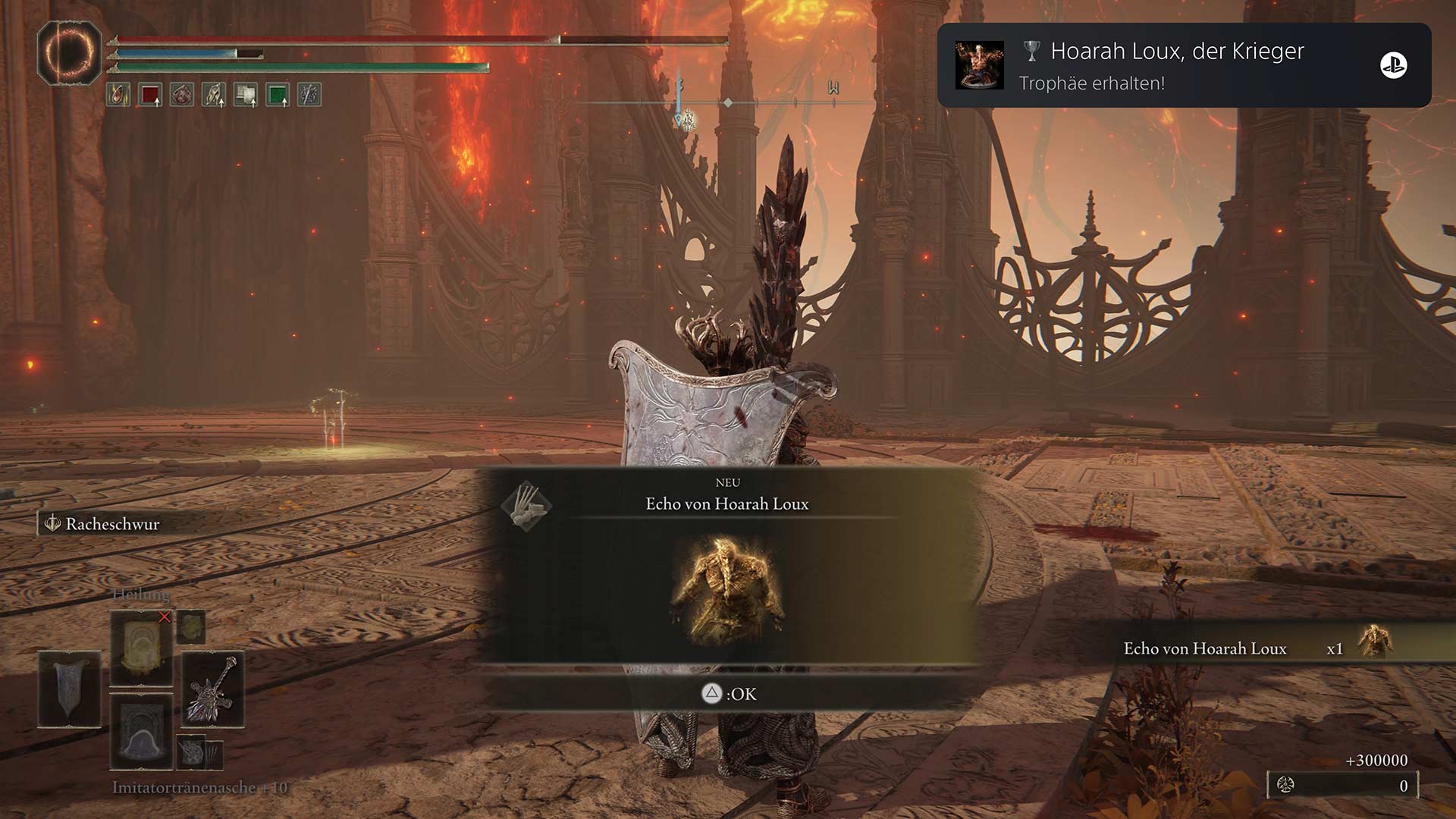 Als Belohnung für euren Sieg gegen Hoarah Loux in „Elden Ring“ erhaltet ihr stattliche 300.000 Runen und das Echo von Hoarah Loux.