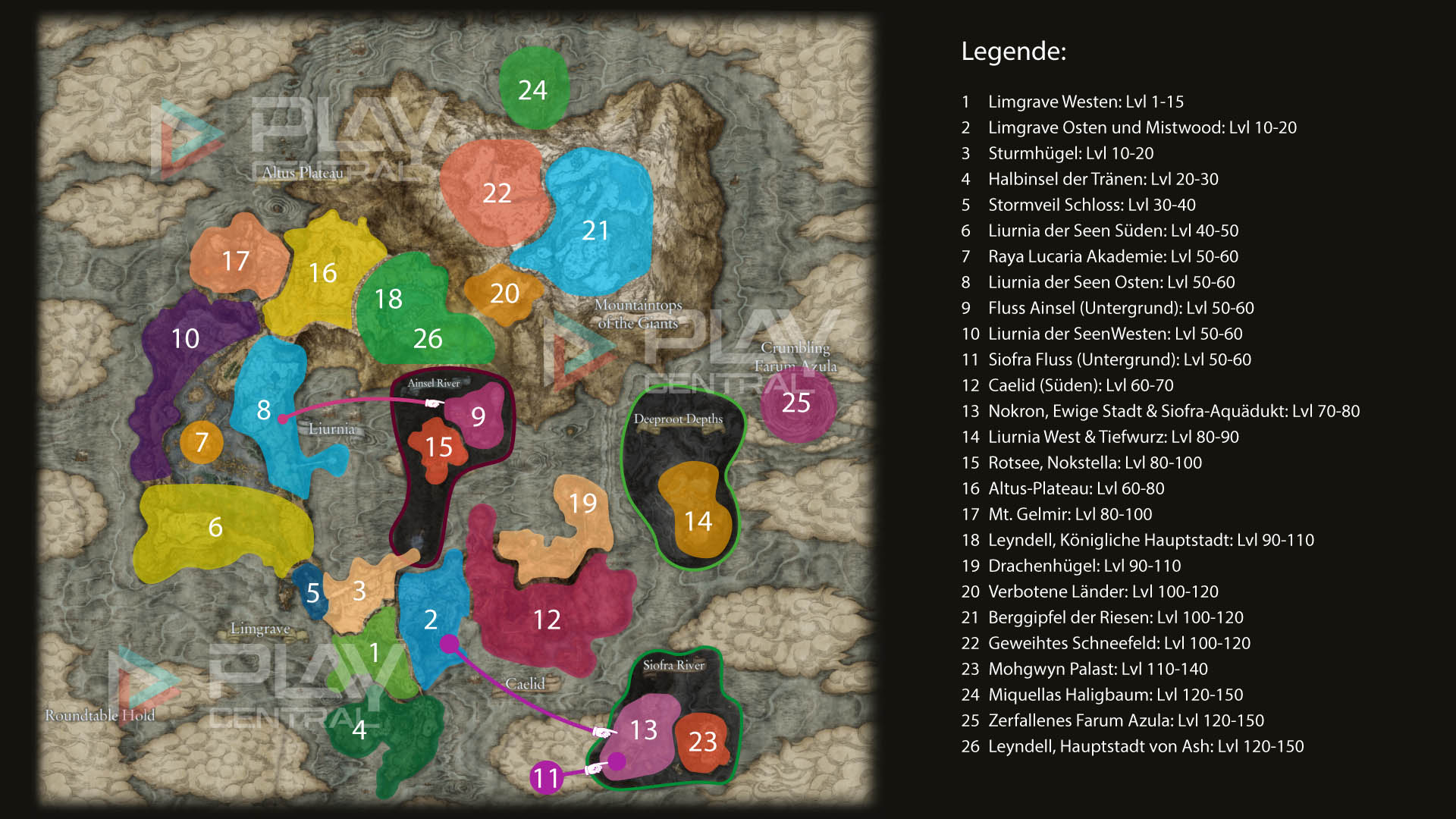Auf unserer Karte, die von echten Expert*innen zusammengestellt wurde, die „Elden Ring“ bereits hoch und wieder runtergespielt haben, könnt ihr genau sehen, welche Reihenfolge der Gebiete empfehlenswert ist und welchen Level euer Charakter bei seiner Erkundungstour ungefähr haben sollte.