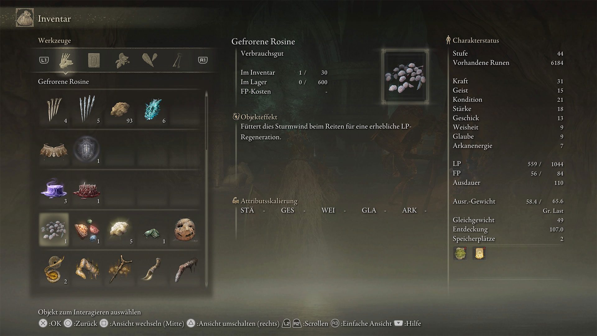 Tipp: Ist Sturmwind verletzt, könnt ihr ihm eine Gefrorene Rosine zu fressen geben. Diese sorgt für eine erhebliche LP-Regeneration. Nach dem Tod eures treuen Begleiters könnt ihr es erneut rufen, das verbraucht allerdings eine Flasche mit Purpurtränen.