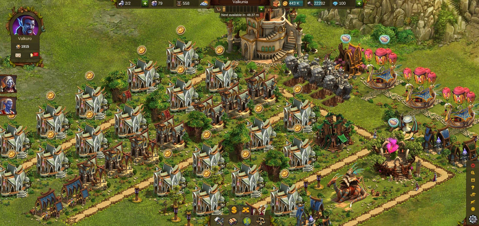 Elvenar überrascht gleich zu Beginn des Spielerlebnisses dadurch, dass man nicht zu einem einzigen Baustil gezwungen wird. Stattdessen fällt wenige Sekunden nach der Anmeldung die wichtigste Spielentscheidung überhaupt und man erklärt sich selbst entweder zum Bürgermeister einer Menschen- oder Elfenstadt. Die Wahl sollte gut bedacht sein, denn ein Wechsel ist zu späteren Zeitpunkten nicht möglich. Dies liegt vor allem auch daran, dass sich die Platzbedürfnisse der verschiedenen Gebäude bei beiden Völkern teilweise unterscheiden. Bei der Wahl zwischen Mensch und Elf sollte man vor allem auf sein Herz und seine Augen vertrauen, denn der größte Unterschied liegt in der Optik der späteren Städte. Während Menschen auf massive Steinbauten setzen und diese mit Holzstreben und Goldelementen zieren, gelten Elfen als sehr stilbewusste Architekten mit einer leichteren Holzbauweise. Laub, leuchtende magische Elemente und Zierden strahlen die Liebe zur Natur aus. Auch meine Entscheidung fiel daher für die Elfen aus. Immerhin bieten sie eine Alternative zur Standardkost. Diese Alternative scheinen viele andere Spieler auch zu sehen. Der Blick auf die Weltkarte und Rangliste lässt kaum Zweifel daran, dass sich die meisten für das Volk der Elfen entscheiden. Dass sich beide Baustile sehen lassen können, offenbart ein Blick in die Städte der vorderen Ranglistenplätze.