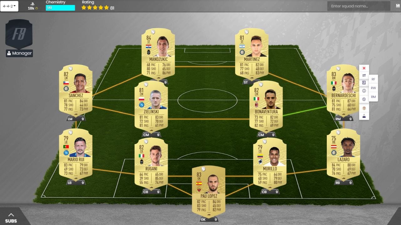 Unser Low-Budget-Team schlägt mit rund 20.000 Münzen zu Buche, überzeugt dabei aber durch ausgeglichene Werte über alle Bereiche hinweg. Pau Lopez im Tor ist ein günstiger und starker Rückhalt.