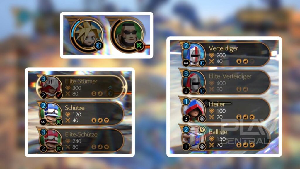 Als Heldeneinheiten wählen wir Cloud und Barret, da wir in diesem Gefecht viele Verteidiger brauchen, die Cloud herbeirufen und die eben erwähnten Schützen, die wiederum Barret herbeizaubern. Außerdem ist Barret selbst ein starker Schütze, was es noch einfacher gestaltet.