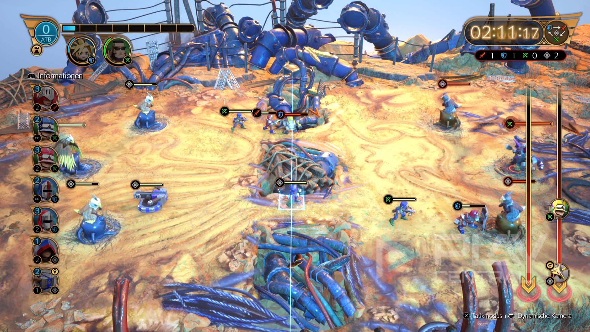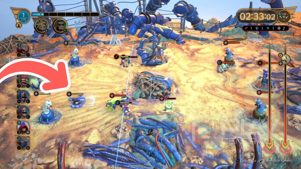 Setzt also mittig zwei Verteidiger ab, die den Oberbefehlshaber abfangen. Und wenn ihr das gemacht habt, sollte sich der Feind in Reichweite für Cloud befinden. Durch die Verteidiger haben wir Clouds Aufladung gepusht. Ruft jetzt Cloud in der Nähe des Oberbefehlshaber, der daraufhin fast ausgeschaltet wird!