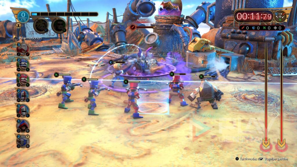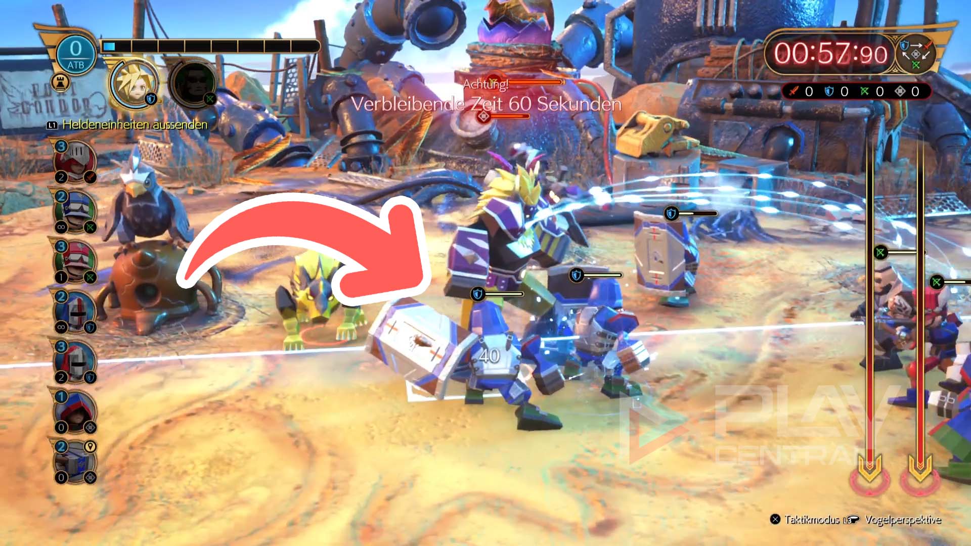 Nicht direkt! Denn jetzt switchen wir zum letzten Schachzug: Wir setzen ab jetzt nur noch auf Schützen. Wenn ihr nun gegen den Oberst kämpft, platziert ihr so viele Schützen, wie es die ATB-Leiste hergibt.