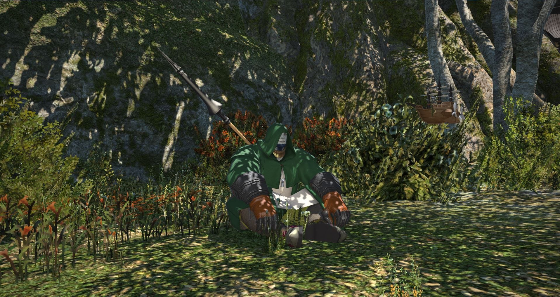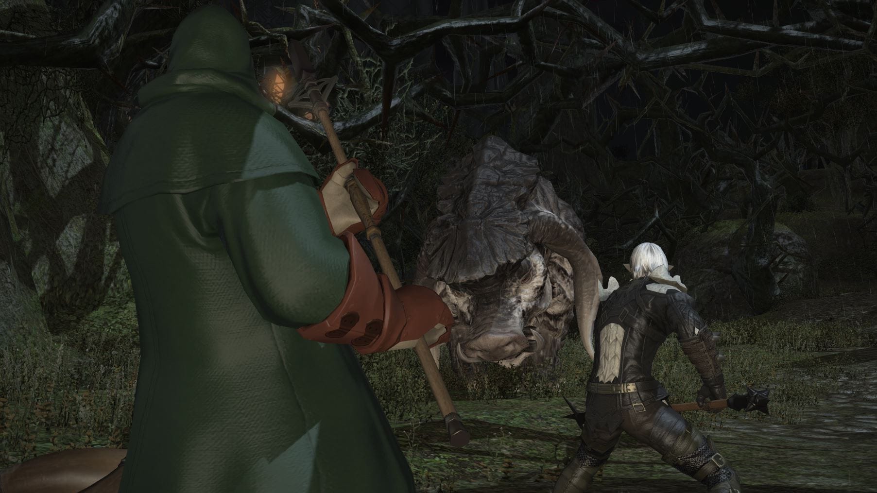 Da sich im Totenacker noch immer niemand finden ließ, nutzte ich die Zeit und machte meine Klassenquest für Level 20. Ab nach Gridania und direkt zur Gilde der Pikeniere. Mein Auftrag war es nun, gemeinsam mit dem zwielichtigen Foulques den Keiler-König zu besiegen. Bevor das aber angegangen werden konnte, musste ich zehn Schweine töten und deren Hauer als Spur platzieren – anders würde sich der Schweinechef nicht blicken lassen. Retrospektiv betrachtet hätte ich mir lieber aus einem der Schweinchen einen leckeren Braten mit viel Soße machen sollen. Verdammt, der Kampf war hart! Nach einer Zwischensequenz kam nämlich der Wutzboss monströs angestiefelt und…ließ sprichwörtlich mächtig die Sau raus. Nicht nur, dass mein feiner Mitstreiter urplötzlich seine Heilfähigkeiten verloren zu haben schien, nein, der Ferkelprinz rief reihenweise neue Gegner auf den Platz. Der erste Versuch ging da leider mächtig in die Hose – neuer Versuch! Oh, schon wieder tot. Grummel. So ging das Spiel dann leider noch einige Male weiter, bis ich die Taktik raushatte und mich einfach nur auf die Adds konzentrierte – den ollen Eberbaron übernahm mein Kollege und besiegte den sogar recht leicht. Immerhin gab die Quest eine neue, coole Lanze für mich und die üblichen Lobpreisungen vom Gildenführer.