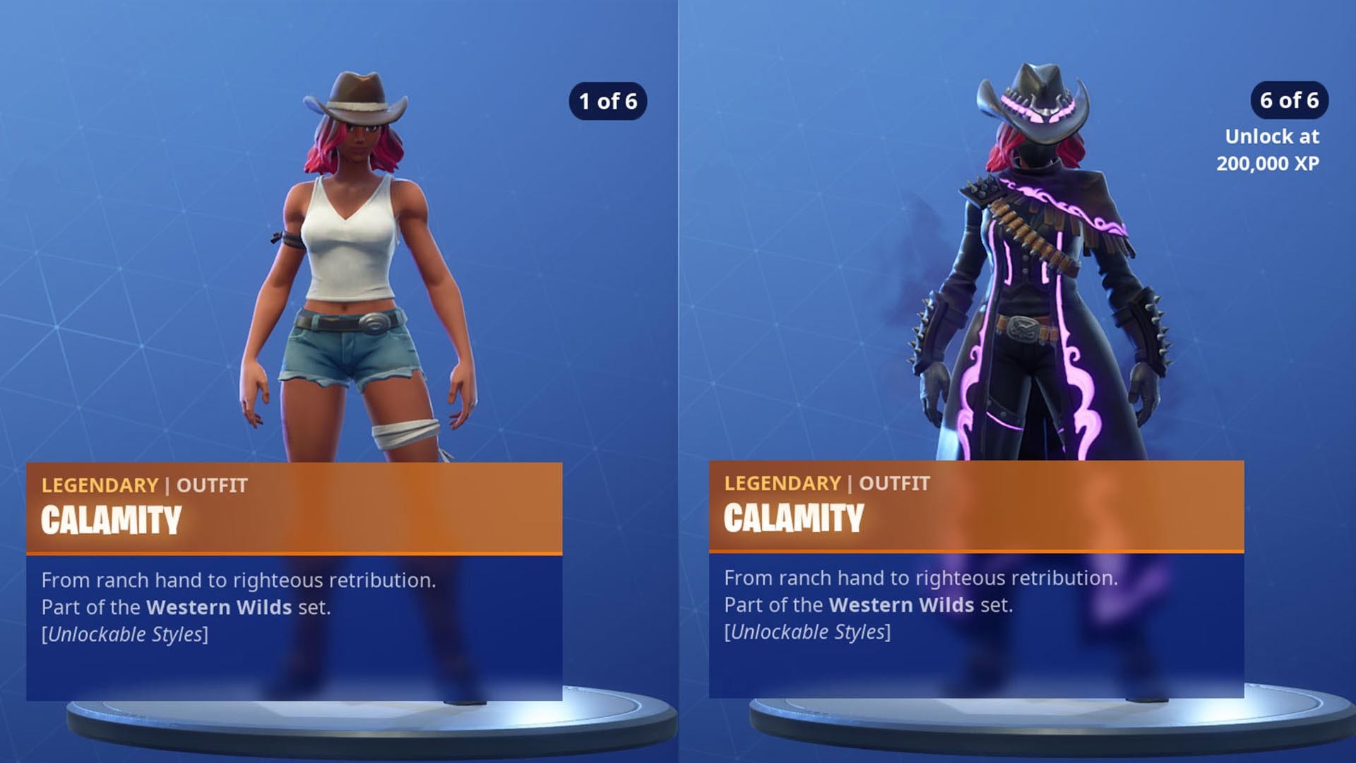 Ein Teaser hat sie vor der Veröffentlichung des Battle Passes aus Season 6 bereits angekündigt. Calamity kommt mit ihrer Montur direkt aus den Wilden Westen. Das legendäre Outfit ist in verschiedene Styles unterteilt, die sich mit dem Fortschritt anpassen lassen. Die Anlehnung an Calamity Jane (Katastrophen-Jane), einer Heldin aus dem Wilden Westen, ist klar erkennbar. Neben Fable und Dire ein ganz klarer Favorit aus Season 6!
