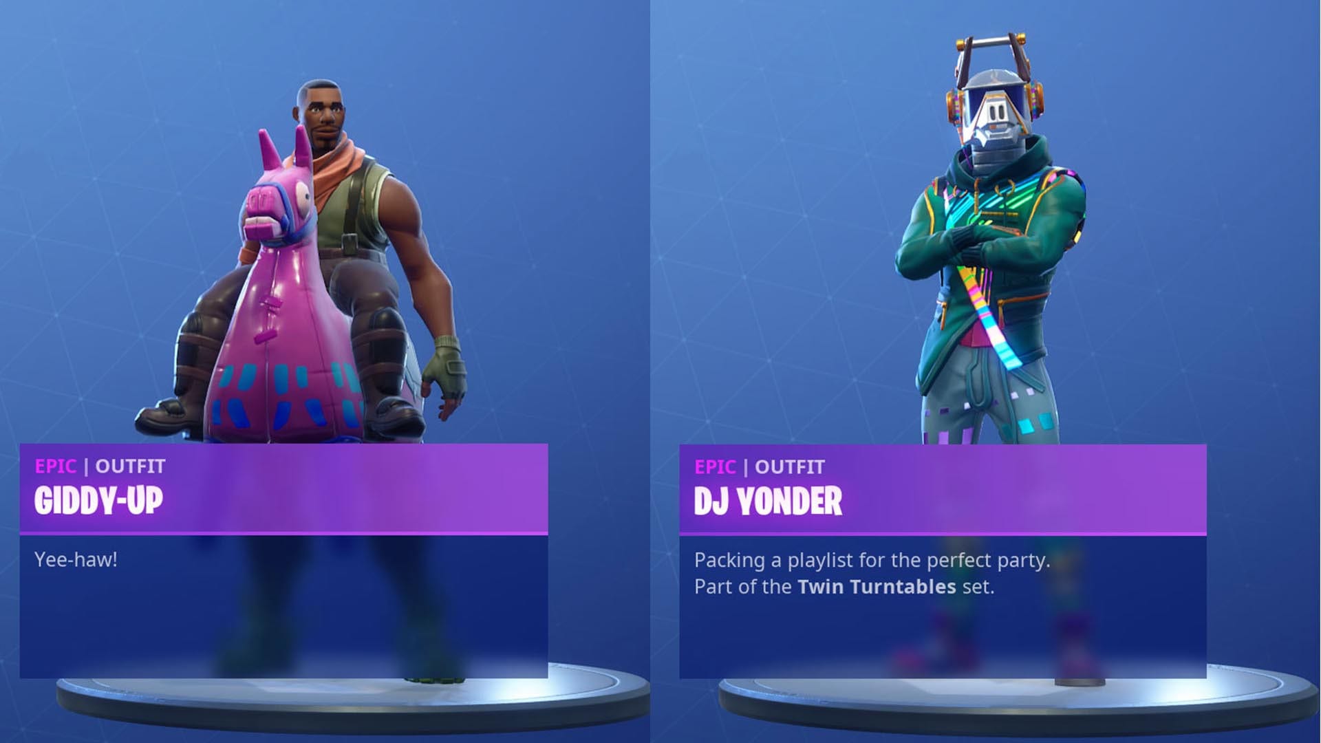 Ebenfalls als ein Partybesucher entpuppt sich wohl Giddy-Up (Ausgesattelt). Ein herkömmliches Outfit, das jedoch den Eindruck erweckt, es würde auf einem Lama (Fortnite-Llama) reiten.