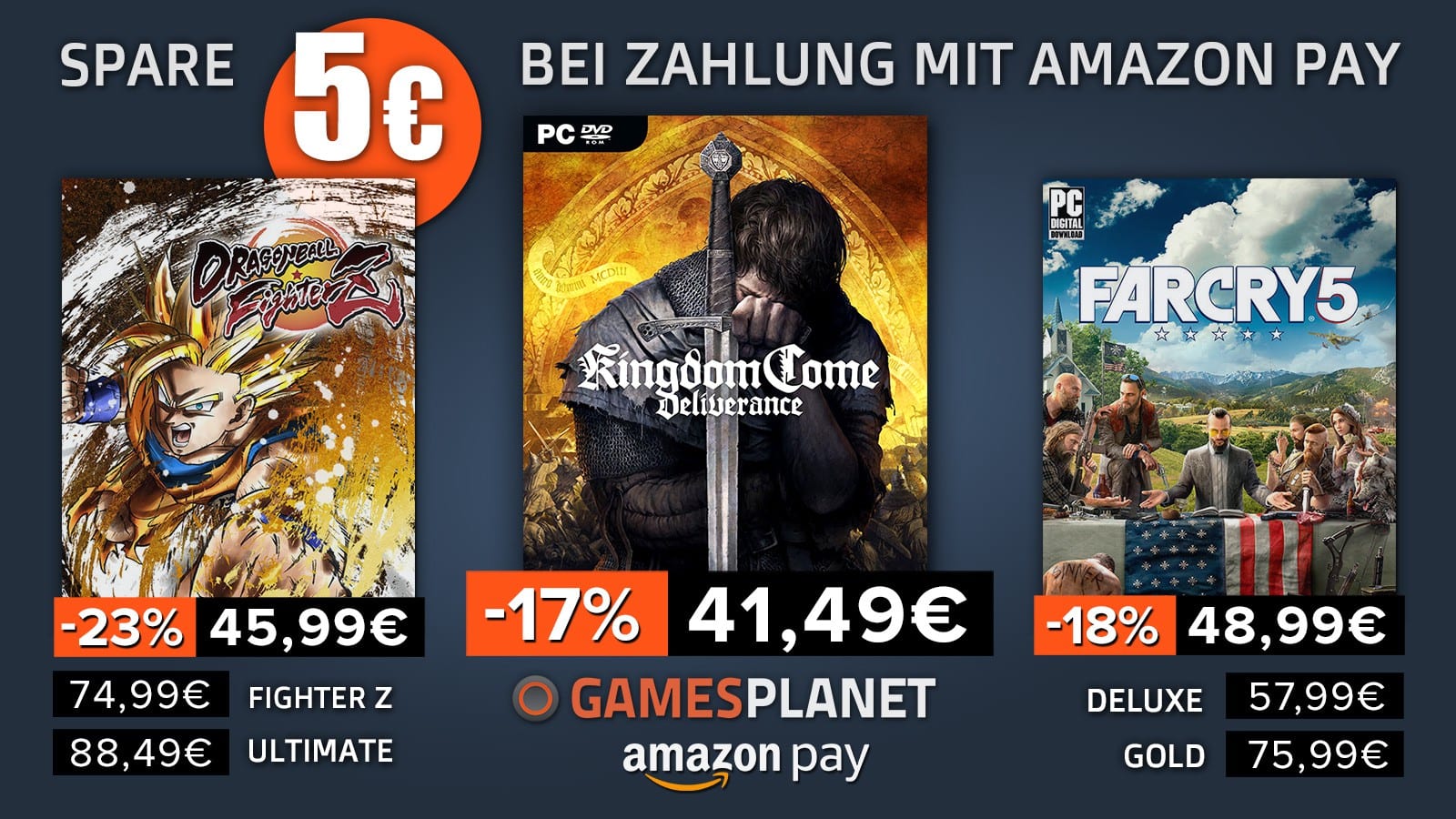 Solltet ihr euch derzeit überlegen das Mittelalter-Rollenspiel Kingdom Come: Deliverance, den Shooter Far Cry 5 oder das Beat'em-Up Dragon Ball Fighter Z zuzulegen, haben wir für euch vielleicht ein lohnendes Angebot am Start. Kauft ihr einen der Titel auf Gamesplanet und zahlt via Amazon Pay, erhaltet ihr einen Rabatt in Höhe von 5 Euro. Außerdem könnt ihr derzeit den Online-Shooter Destiny 2 zu einem reduzierten Preis erwerben.