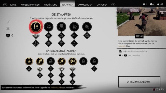Immer wenn es brenzlig wird oder ihr mehrere Gegner auf einmal vor euch seht, helfen die Geist-Waffen weiter. Ihr habt unter anderem die Auswahl zwischen Kunai, Haftbomben, Windglocken und vielen weiteren Hilfsmitteln.